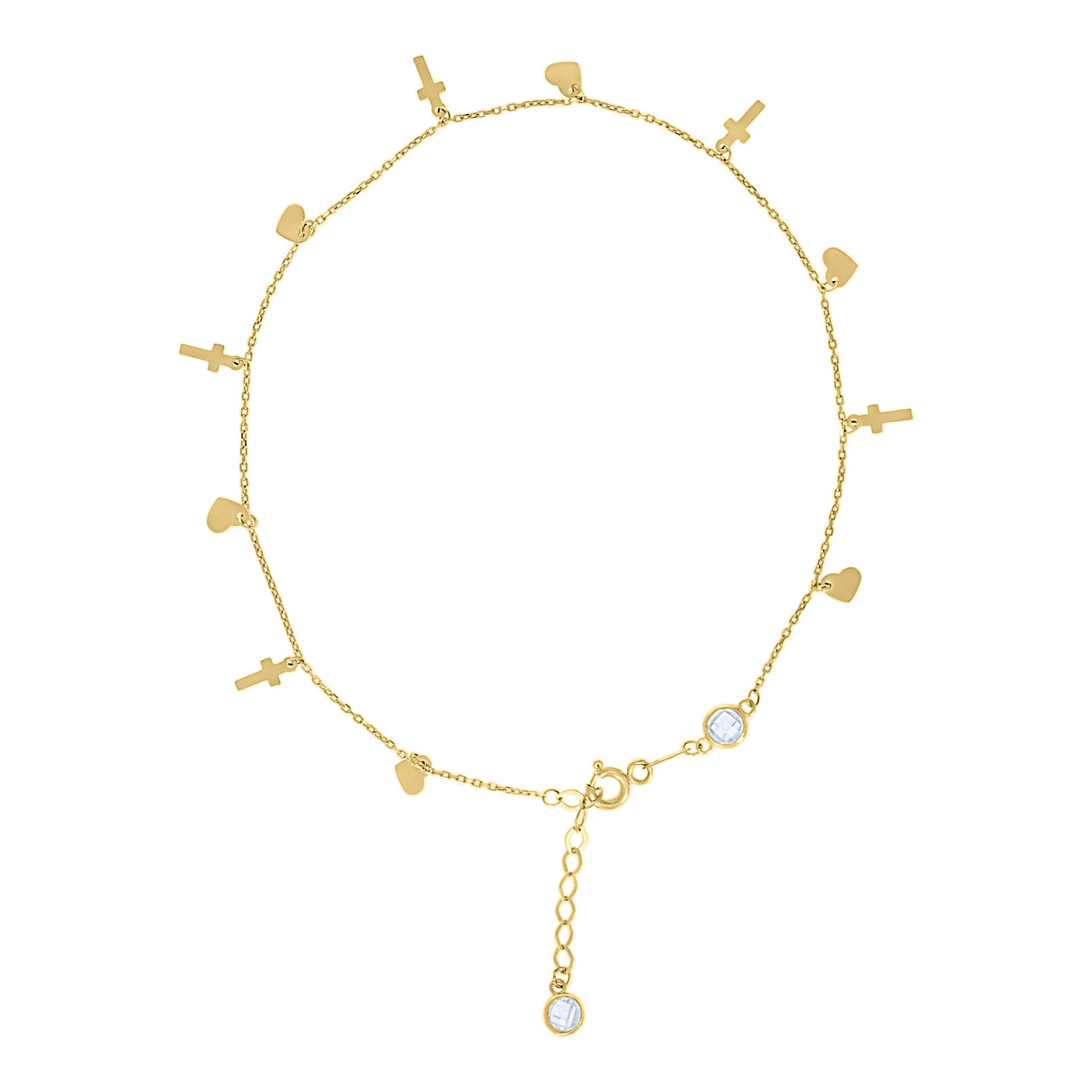 10kt Yellow Gold Womens Cubic-Zirconia Heart Cross Charms Chain Anklet Size 9 + 1 Inches