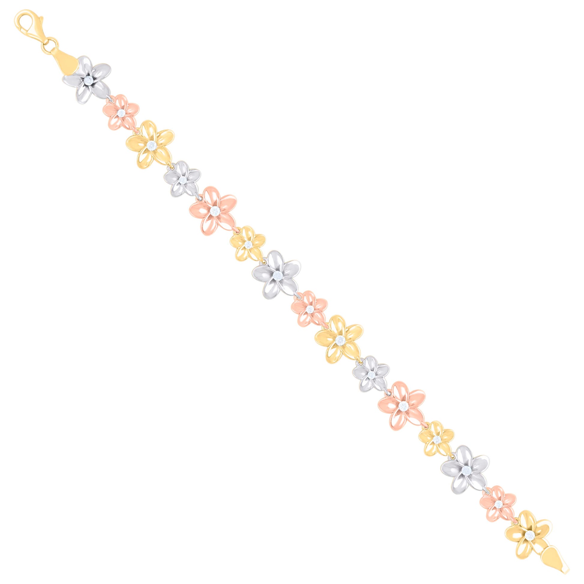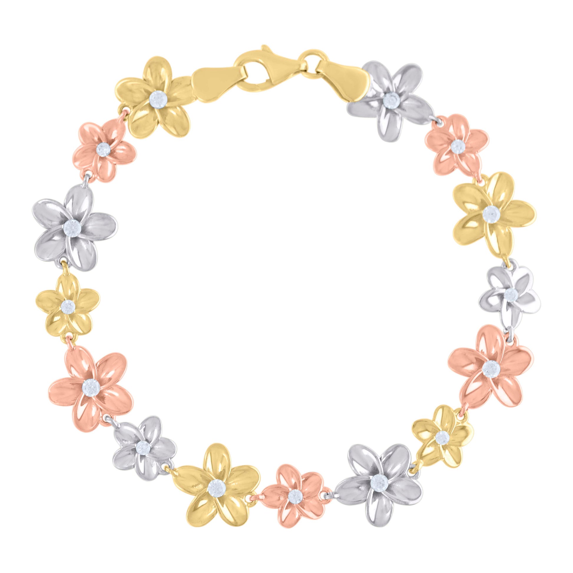 10kt Tri-Color Gold Womens Cubic-Zirconia Flower Link Fashion Bracelet Size 8 Inches