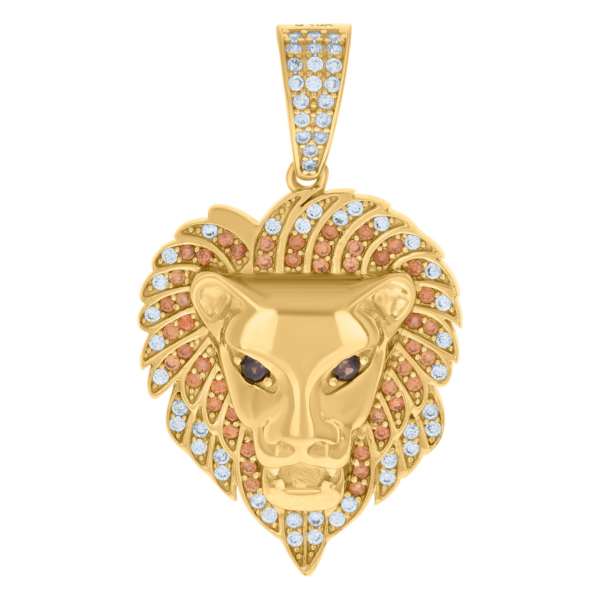 10kt Yellow Gold Mens Red/Brown White Cubic-Zirconia Leo/Lion Head Zodiac Sign/Wildlife Charm Pendant