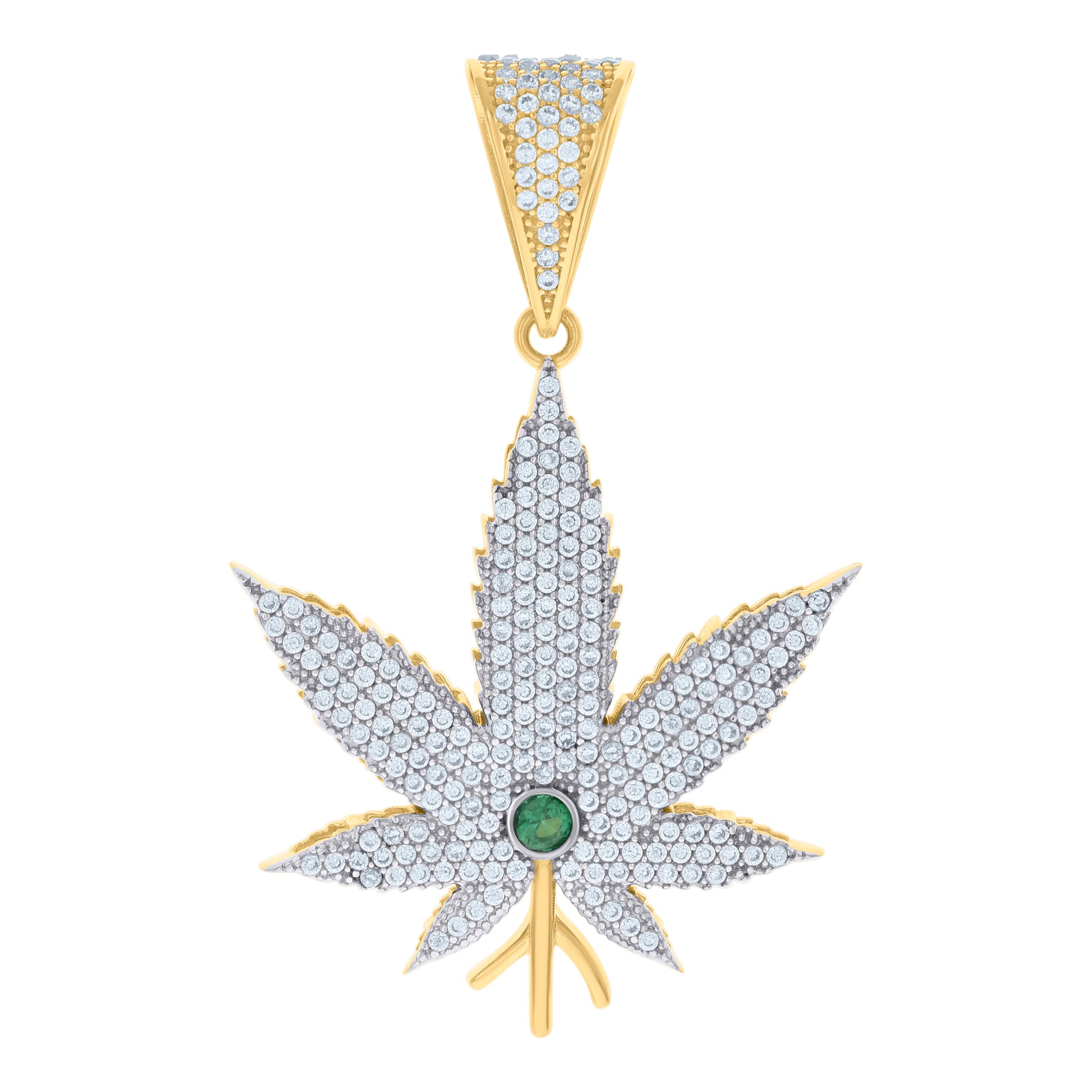 10kt Two-tone Gold Mens Green White Cubic-Zirconia Marijuana Leaf Fashion Charm Pendant