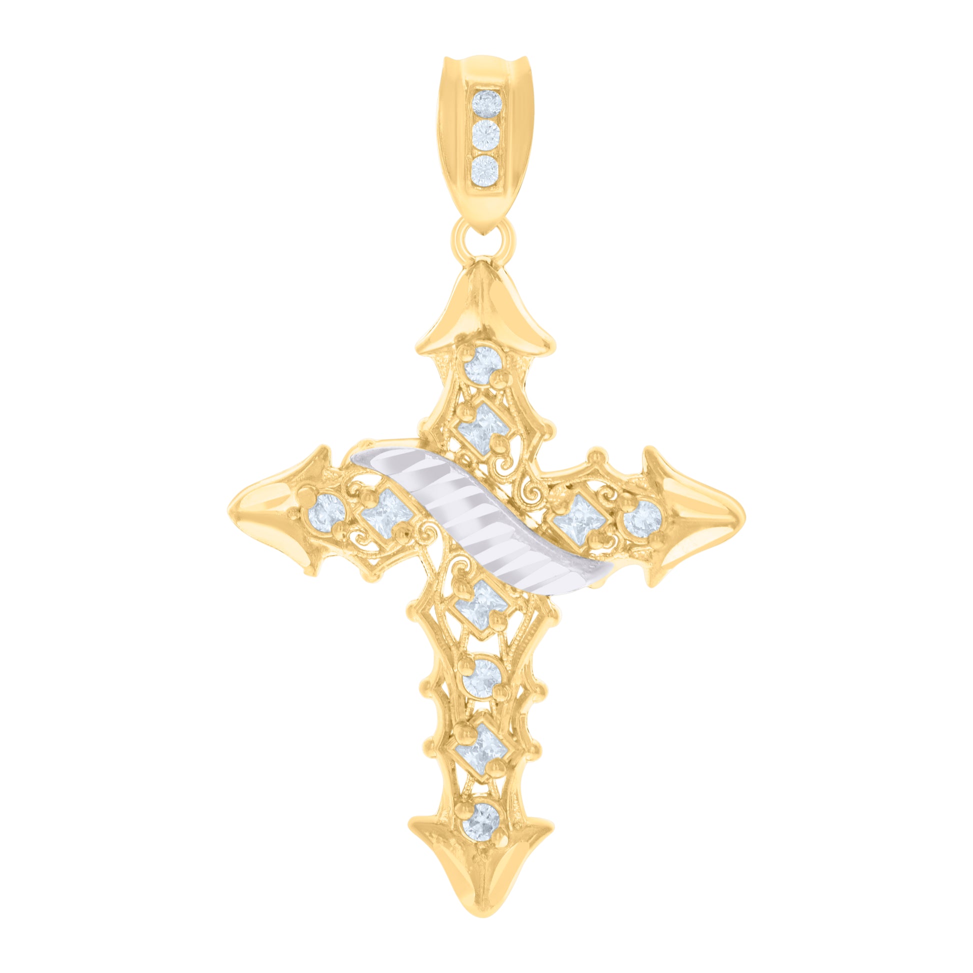 10kt Two-tone Gold Mens Princess-cut Round Cubic-Zirconia Filigree Cross Religious Charm Pendant