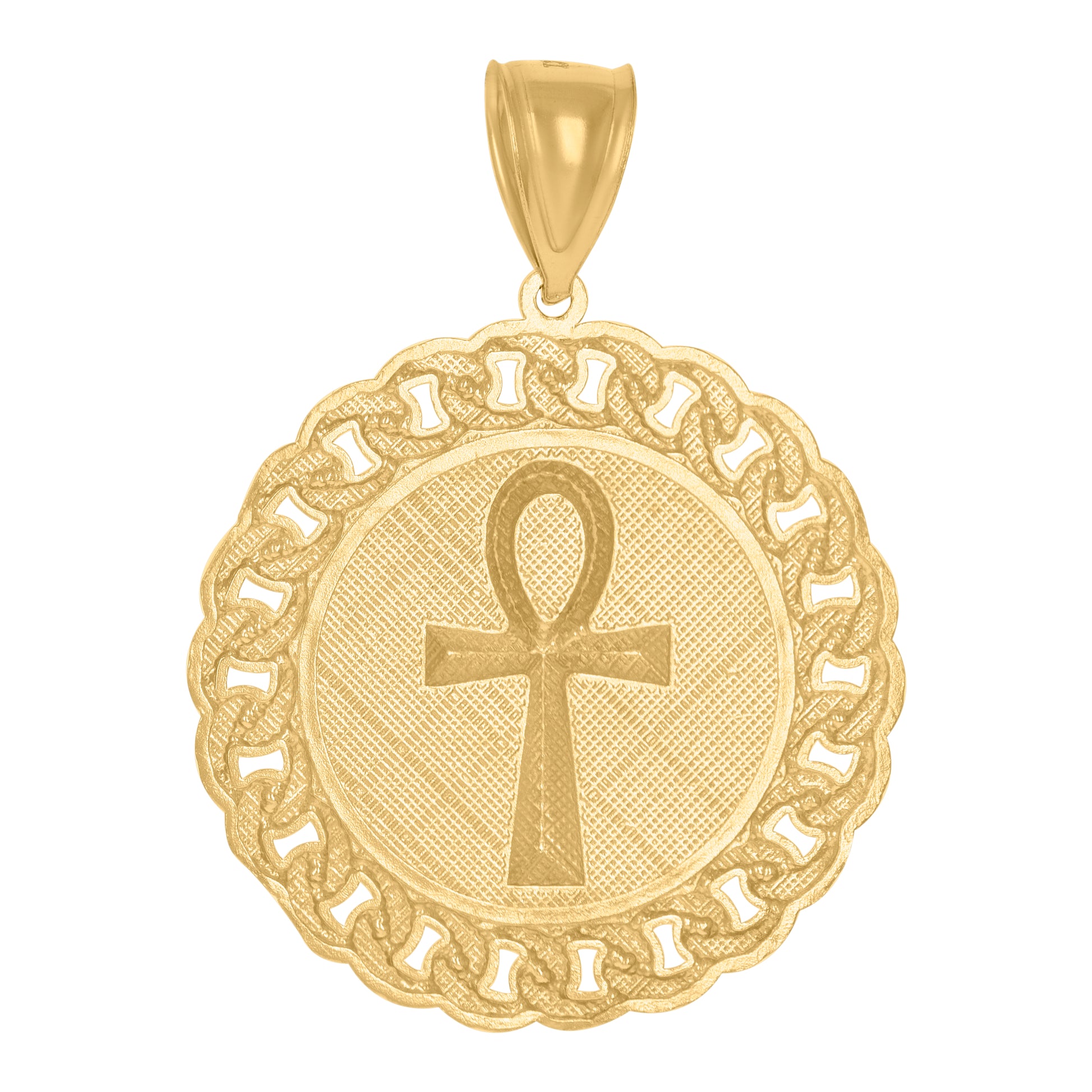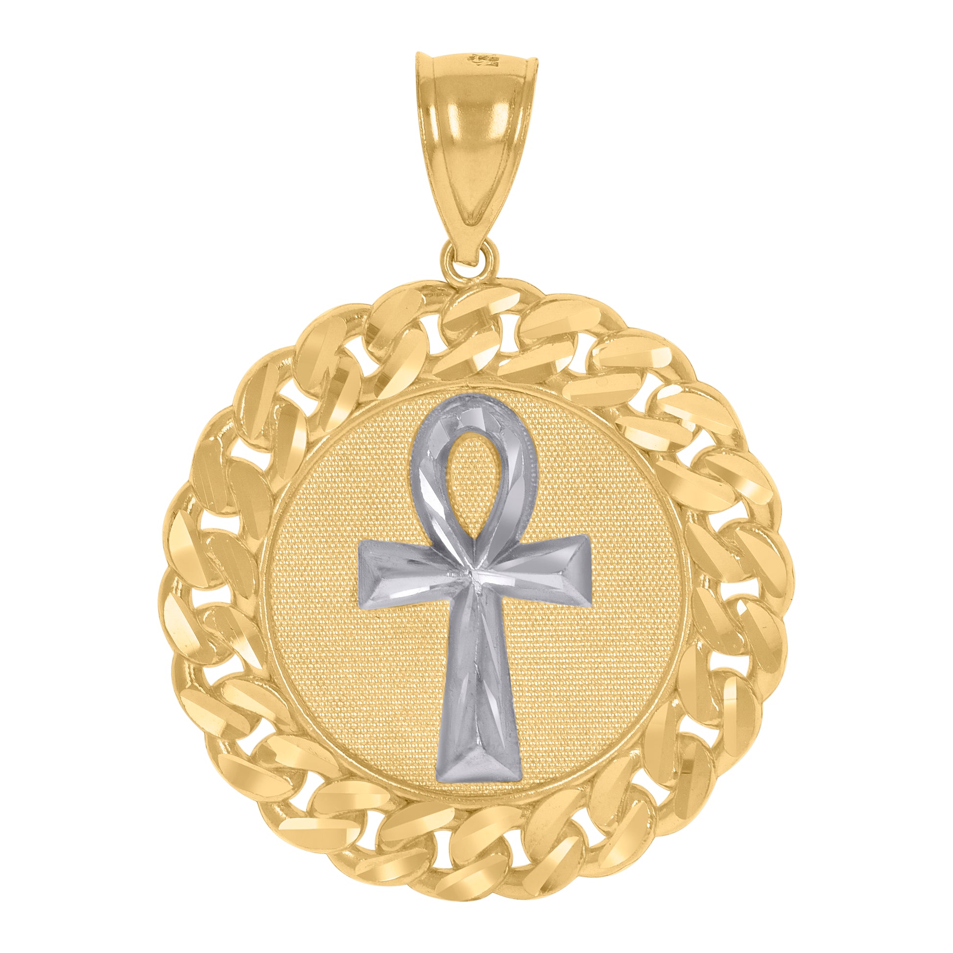 10kt Gold Two-Tone Textured Mens Ankh Cross Religious Cuban Link Medallion Charm Pendant