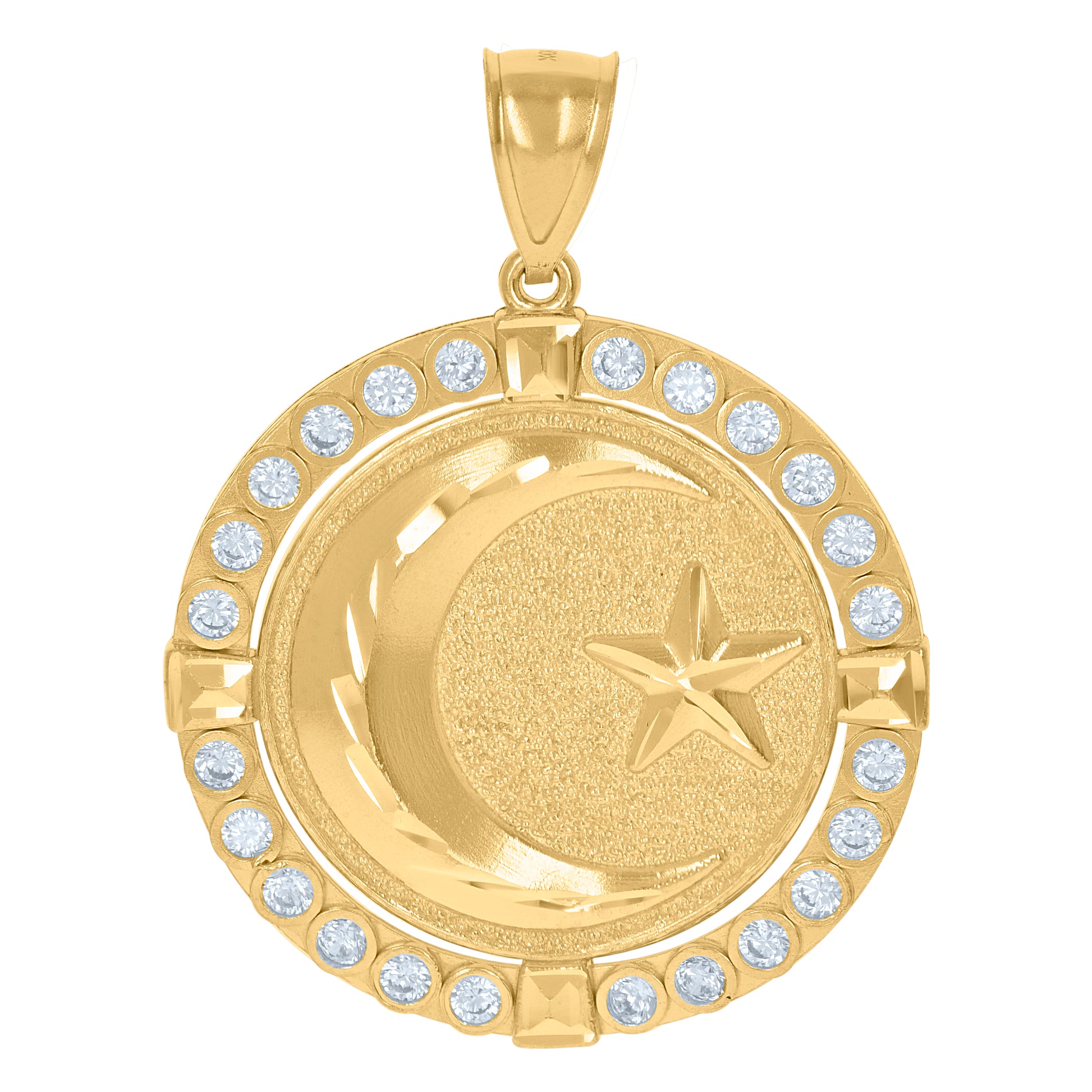 10kt Gold Two-Tone Cubic-Zirconia Diamond-Cut Mens Crescent Moon Star Religious Medallion Charm Pendant