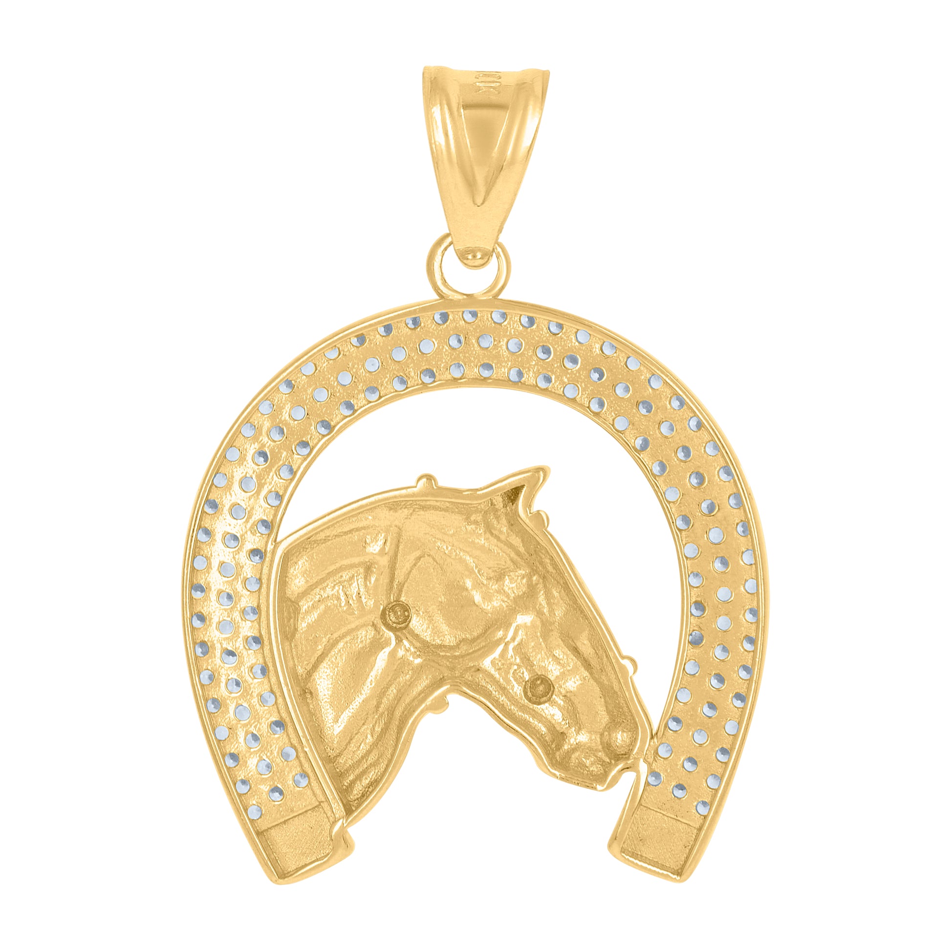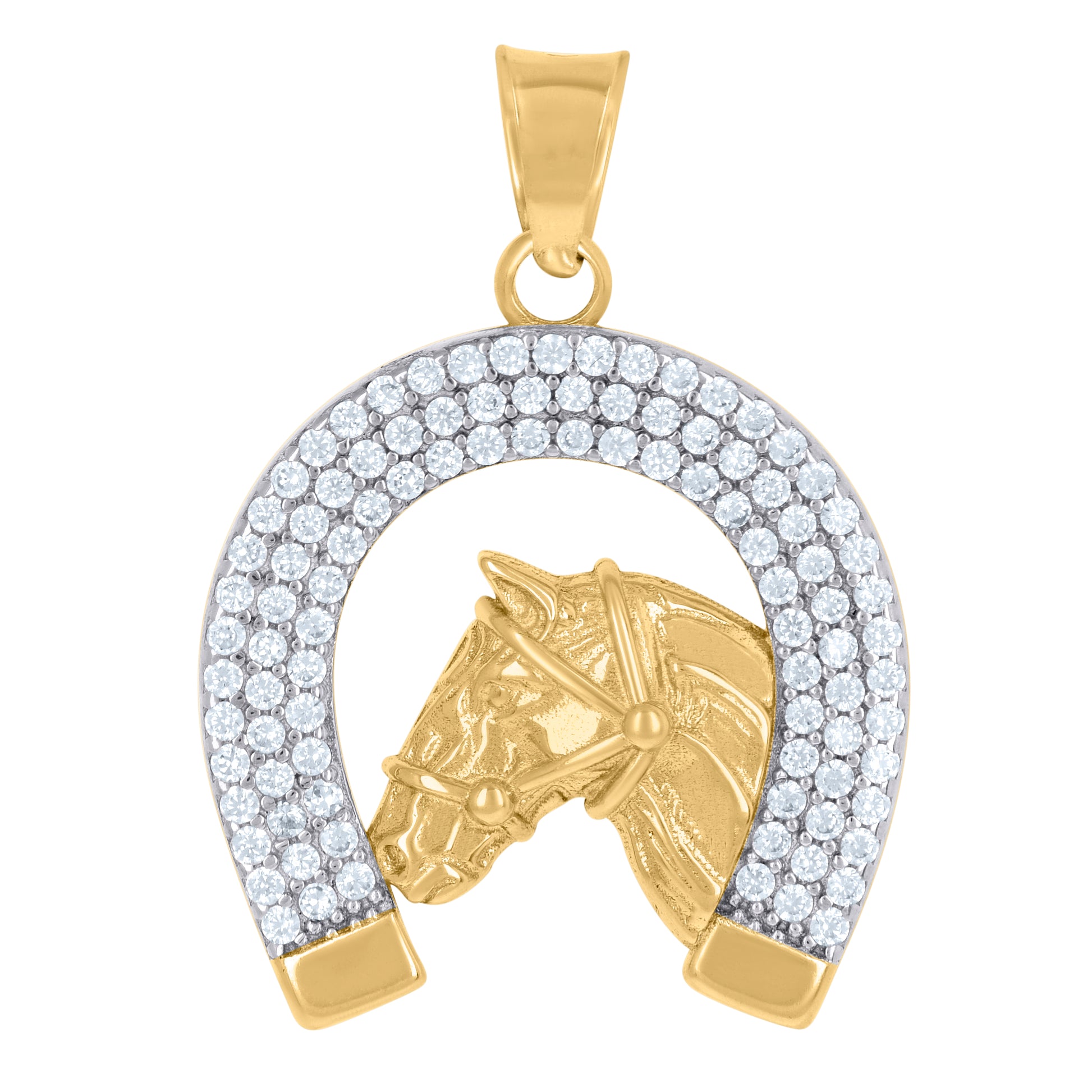 10kt Two-Tone Gold Mens Cubic-Zirconia Horse Head Horseshoe Good Luck Charm Pendant