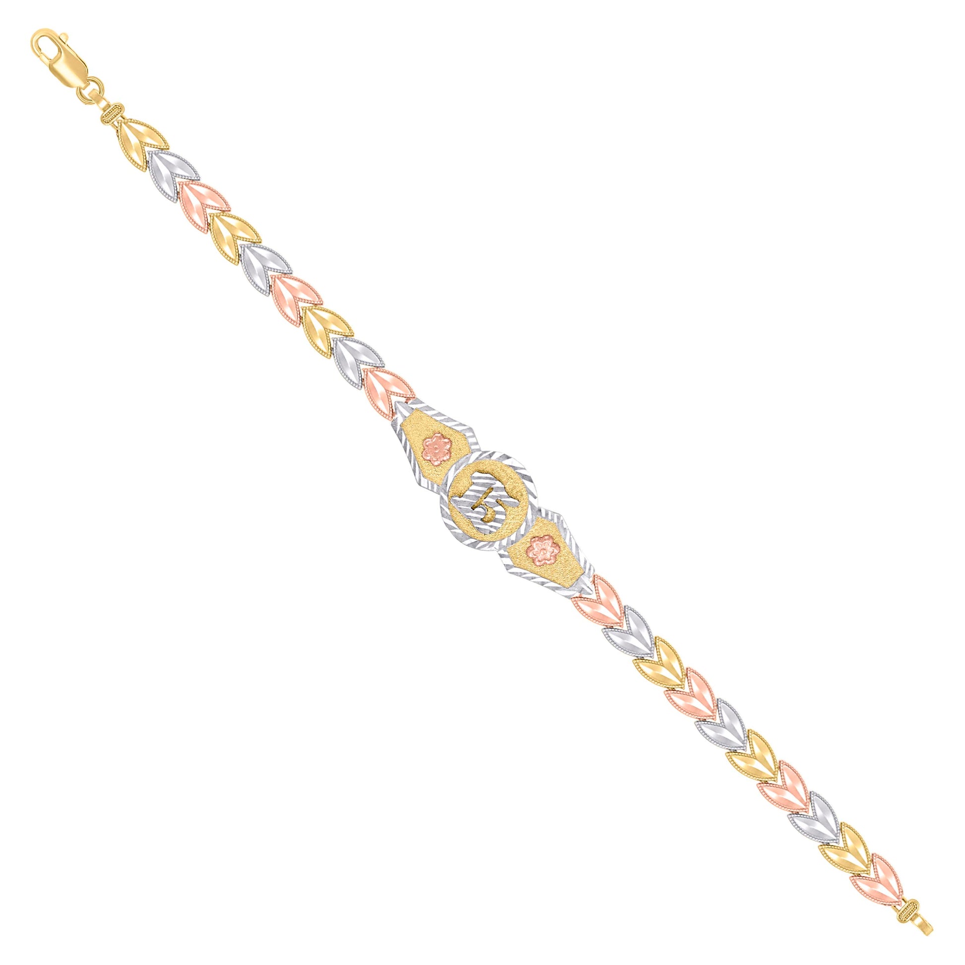 14kt Tri-Color Gold Womens 15 Quinceanera Charm Bracelet Size 7.5 Inches