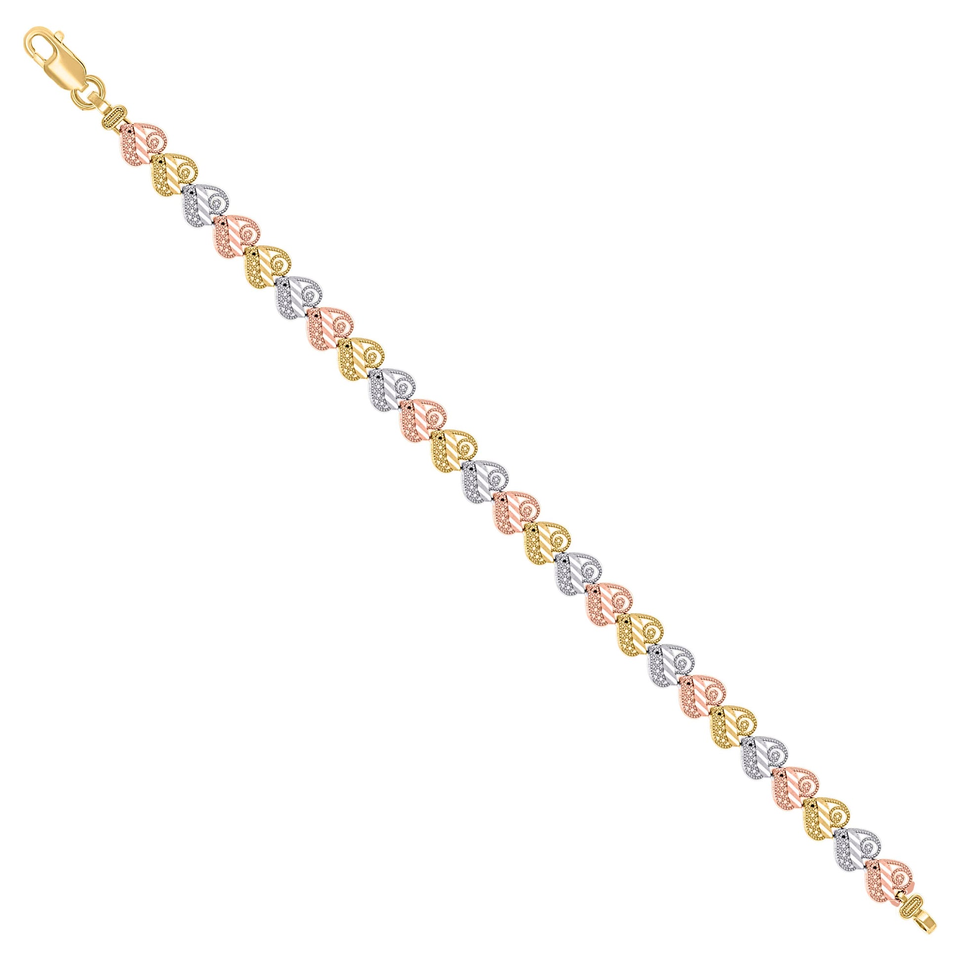 14kt Tri-Color Gold Womens Hearts Link Bracelet Size 7.5 Inches