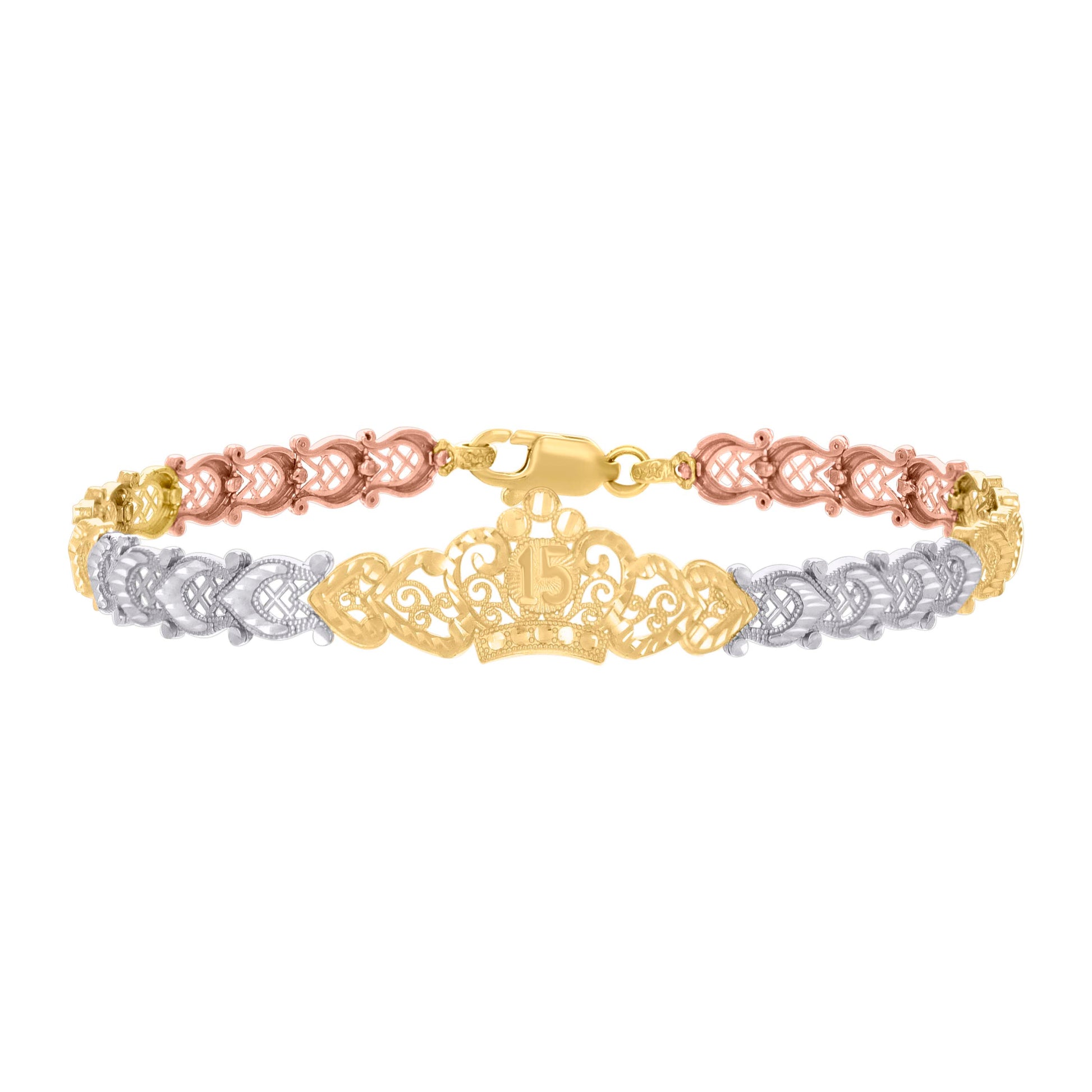 14kt Tri-Color Gold Womens Crown 15 Anos Quinceanera Charm Bracelet
