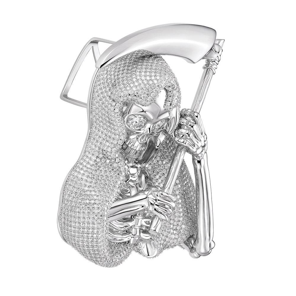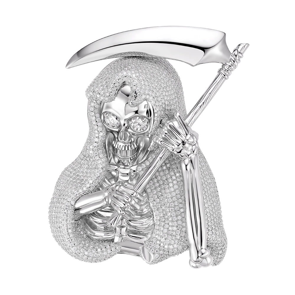 Step into the shadows with this masterfully detailed Grim Reaper pendant, a symbol of power, mystery, and the eternal edge of time. Fully sculpted in 3D, this pendant features a lifelike skeletal figure gripping a polished scythe with dramatic presence. The eyes gleam with large size stones, enhancing the pendant's haunting and luxurious look.The reapers hooded cloak is fully encrusted with shimmering round moissanite stones this pendant combines gothic flair with high-end street fashion.