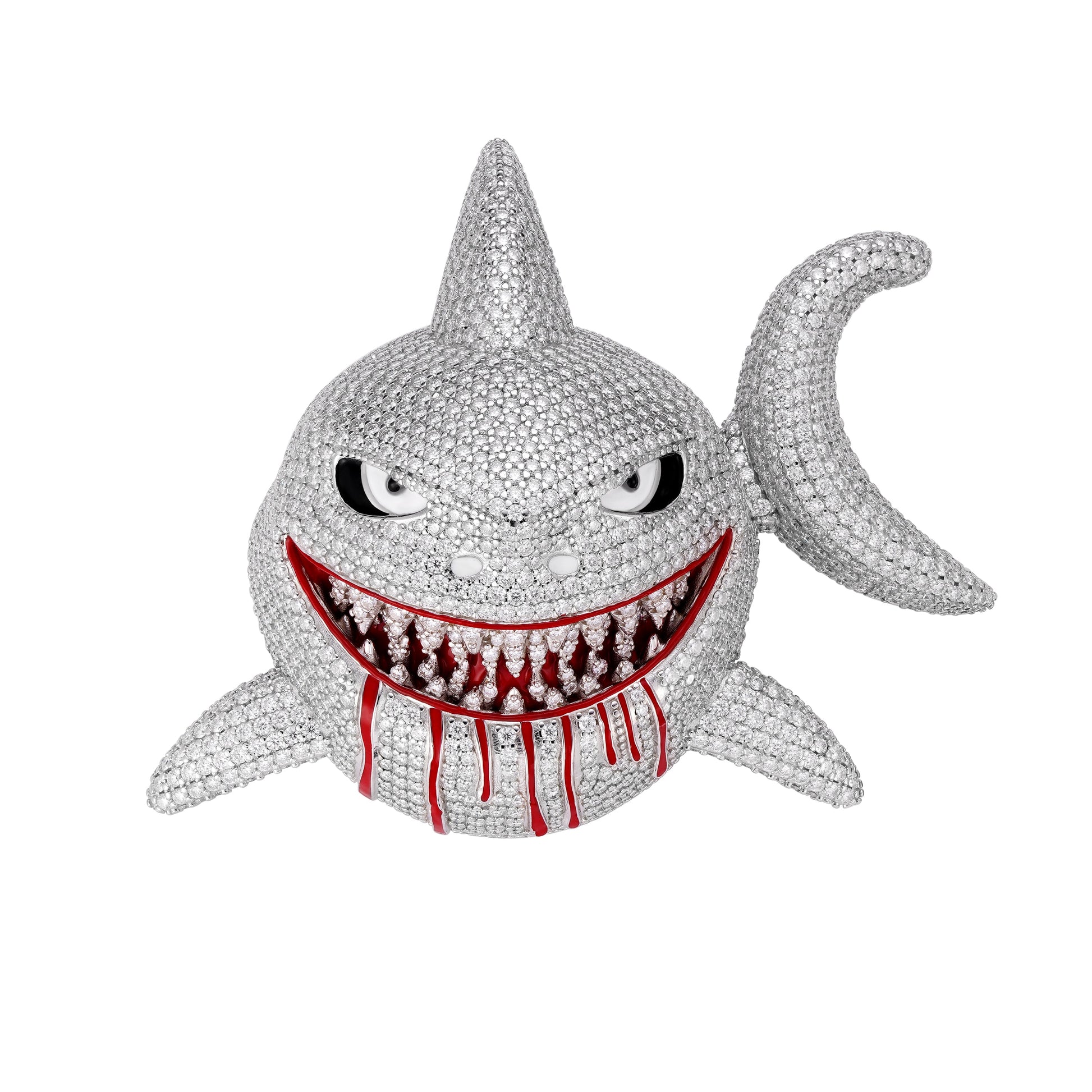 Make a bold and fearless statement with this Shark Pendant, its razor-sharp teeth stained with a splash of red creating a dramatic "bloody mouth" effect.The aggressive expression and lifelike craftsmanship capture the untamed energy of the ocean's most feared predator. Made from high-quality sterling silver, adorned with shimmering moissanite stones for extra shine, this pendant is ideal for streetwear lovers, hip-hop fashion, or anyone drawn to the wild side of the deep sea.