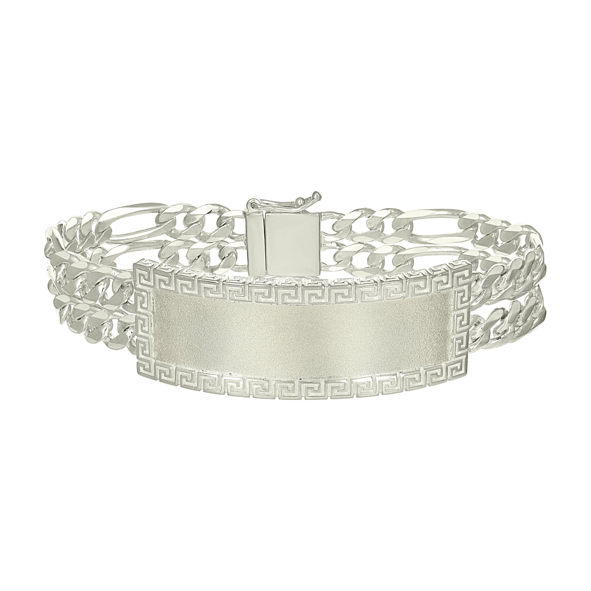 925 Sterling Silver Mens Figaro Link Greek Key ID Bracelet Size 8 Inches