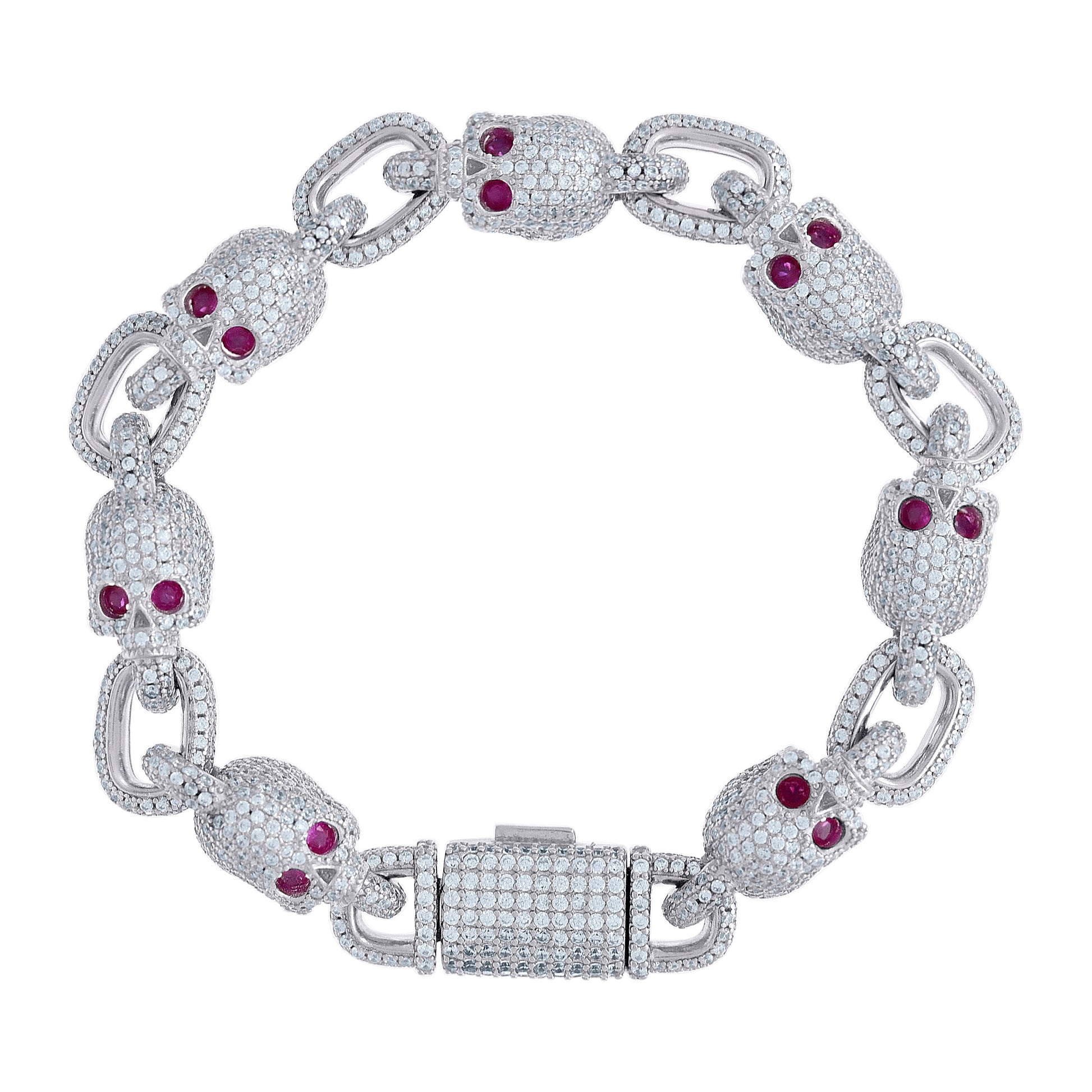 925 Sterling Silver Mens Red White Cubic-Zirconia Skull Link Fashion Bracelet Size 8 Inches