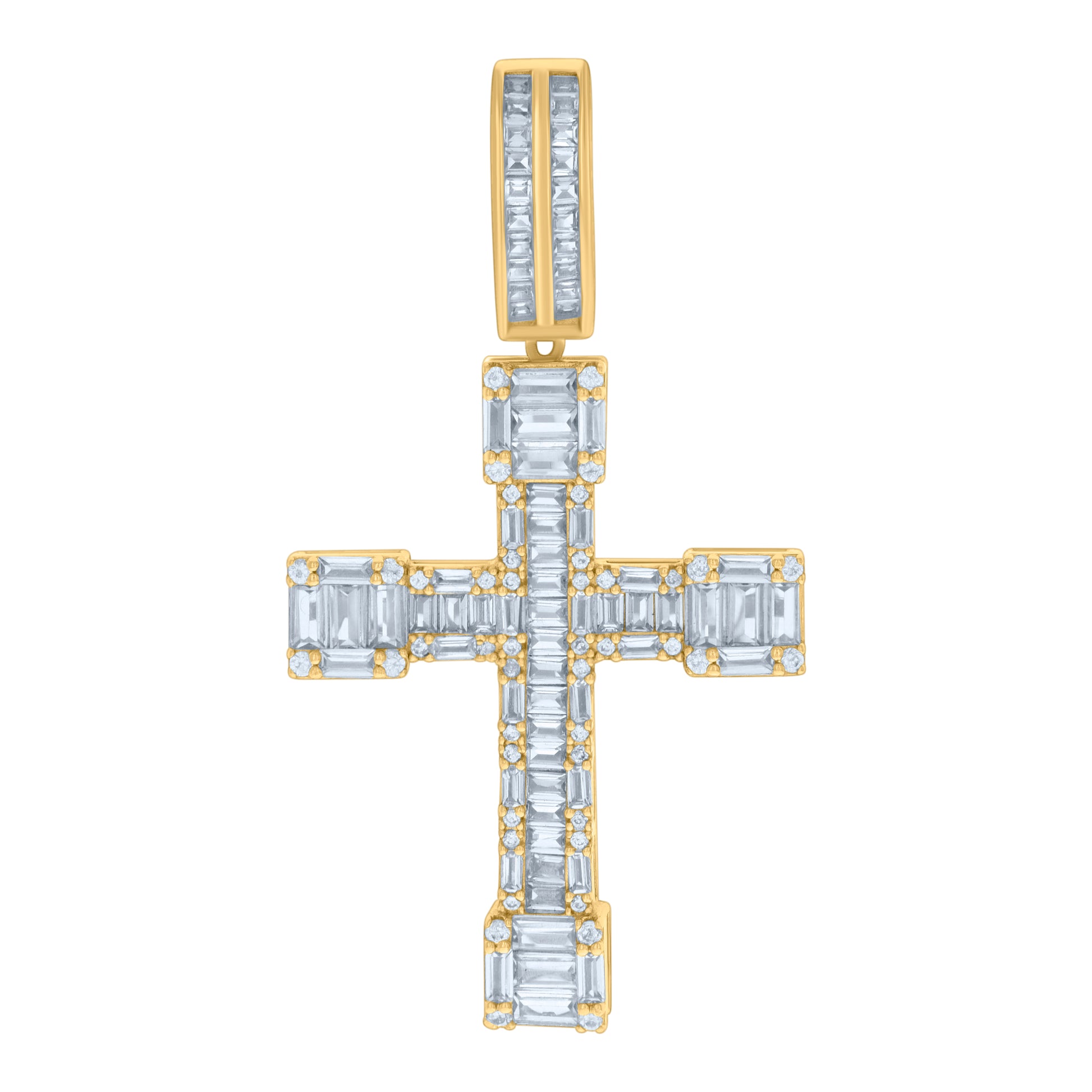 925 Sterling Silver Yellow-tone Mens Baguette Round Cubic-Zirconia Cross Religious Charm Pendant
