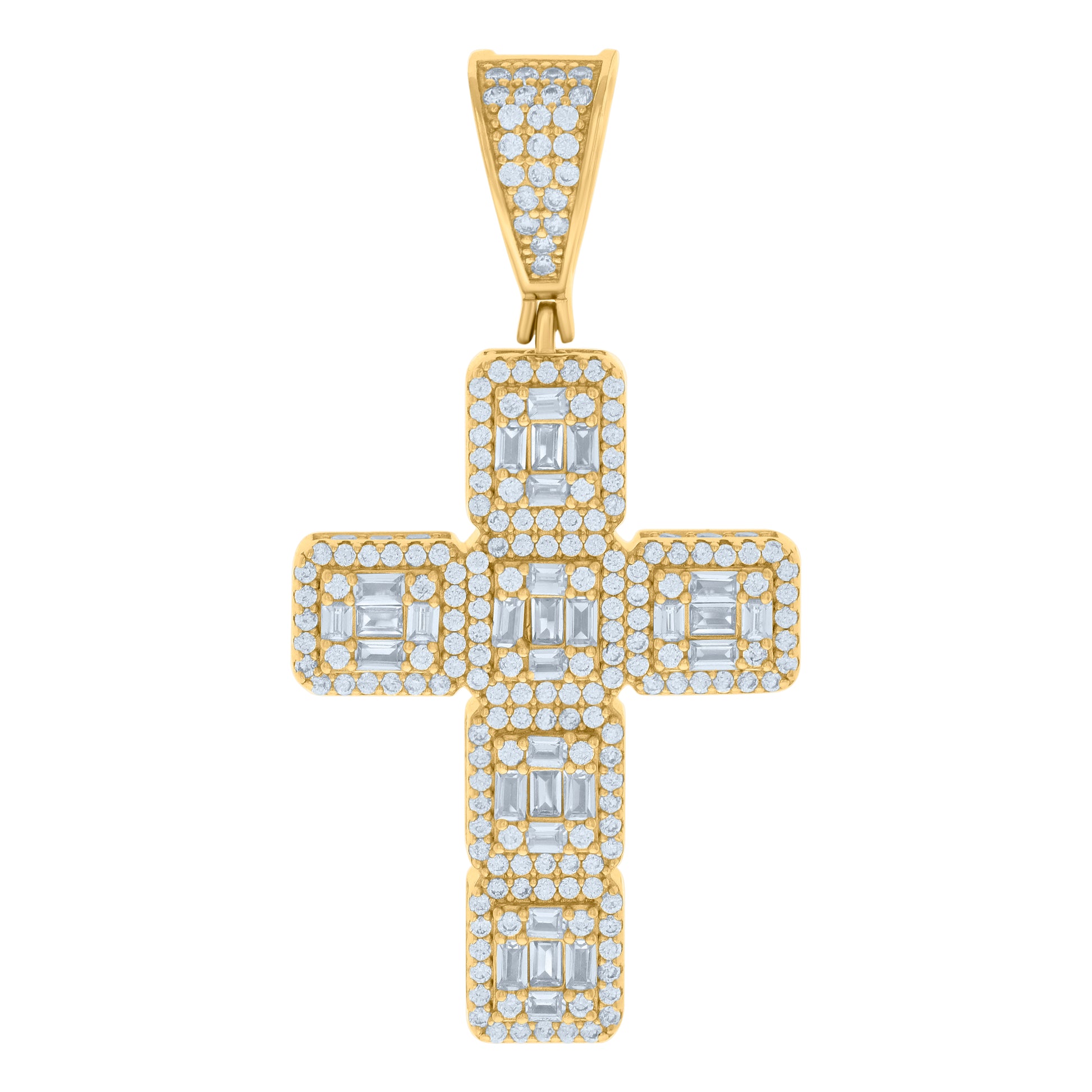 925 Sterling Silver Yellow-tone Mens Baguette Round Cubic-Zirconia Cross Religious Charm Pendant