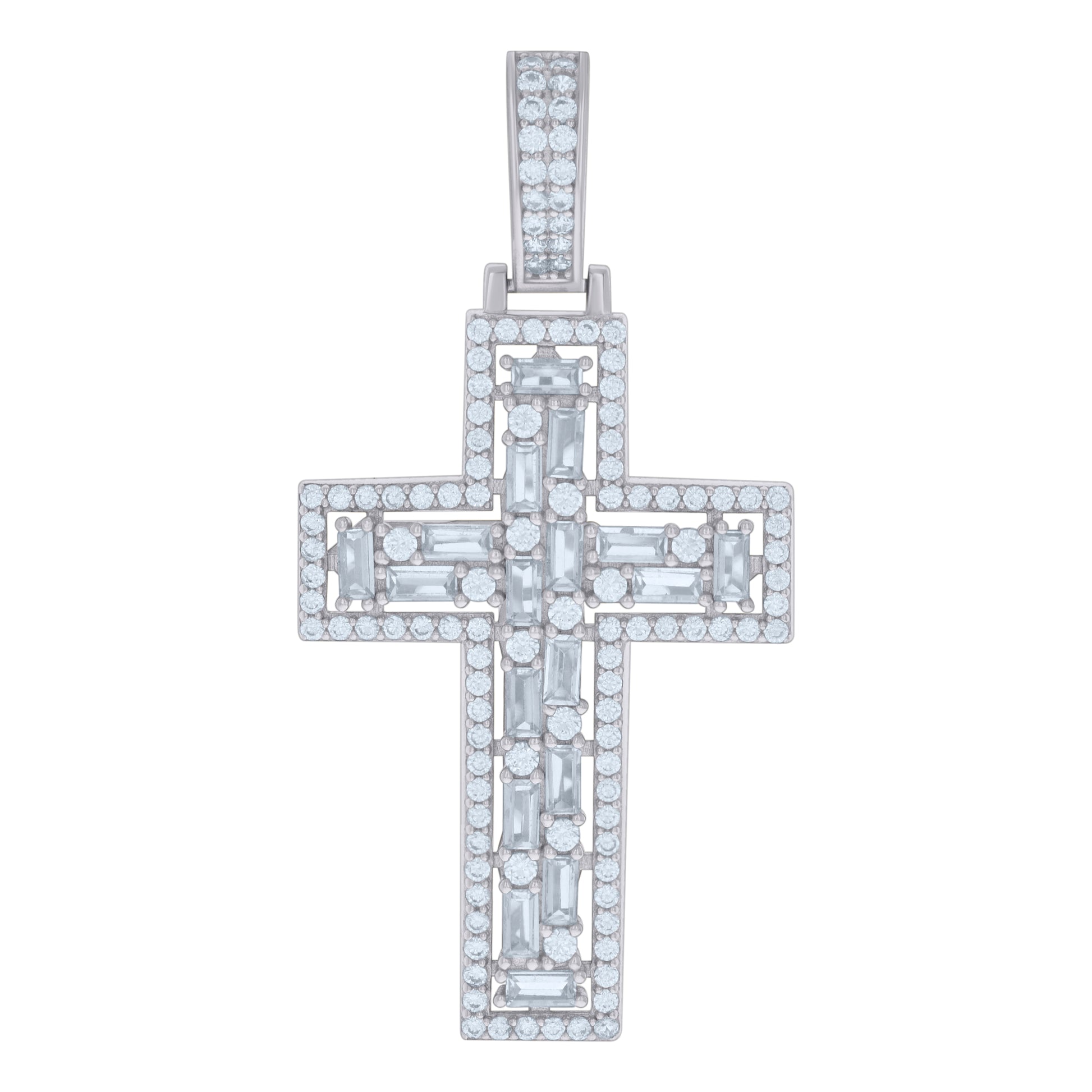 925 Sterling Silver Mens Baguette Round Cubic-Zirconia Cross Religious Charm Pendant
