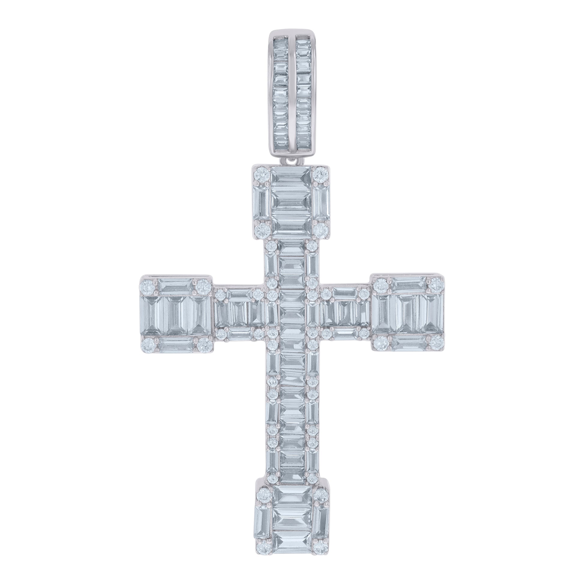 925 Sterling Silver Mens Baguette Round Cubic-Zirconia Cross Religious Charm Pendant