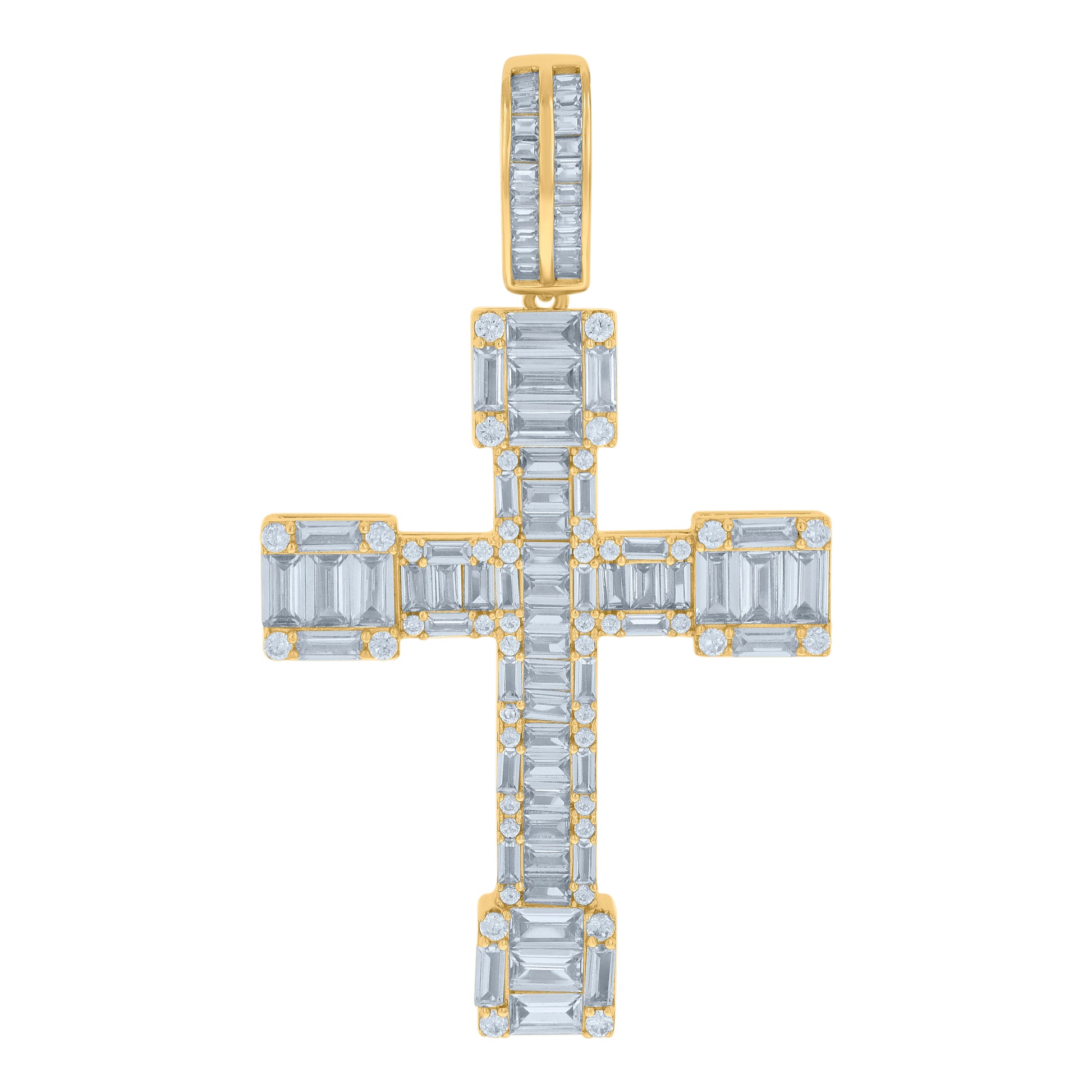 925 Sterling Silver Yellow-tone Mens Baguette Round Cubic-Zirconia Cross Religious Charm Pendant