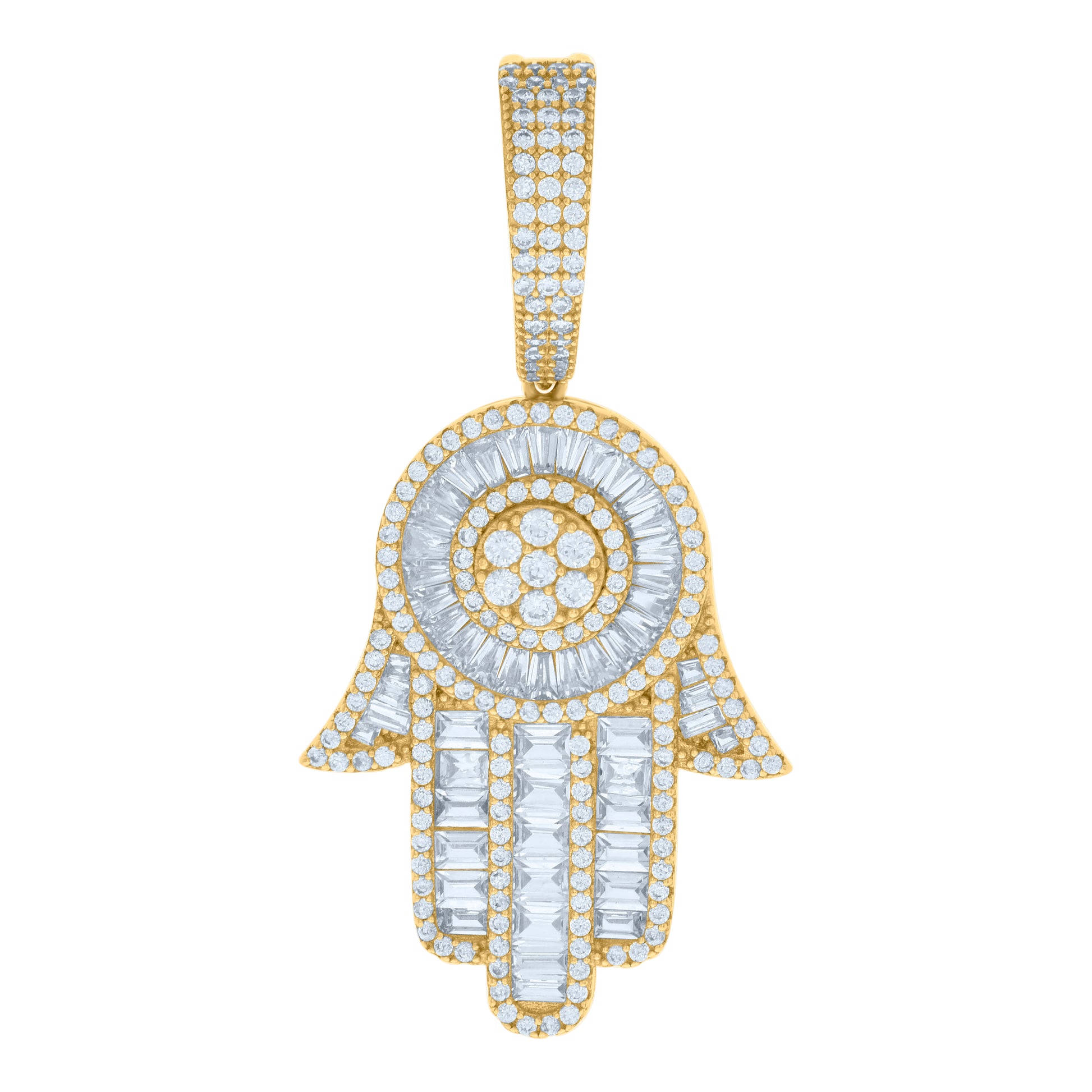 925 Sterling Silver Yellow-tone Mens Baguette Round Cubic-Zirconia Hamsa Religious Charm Pendant