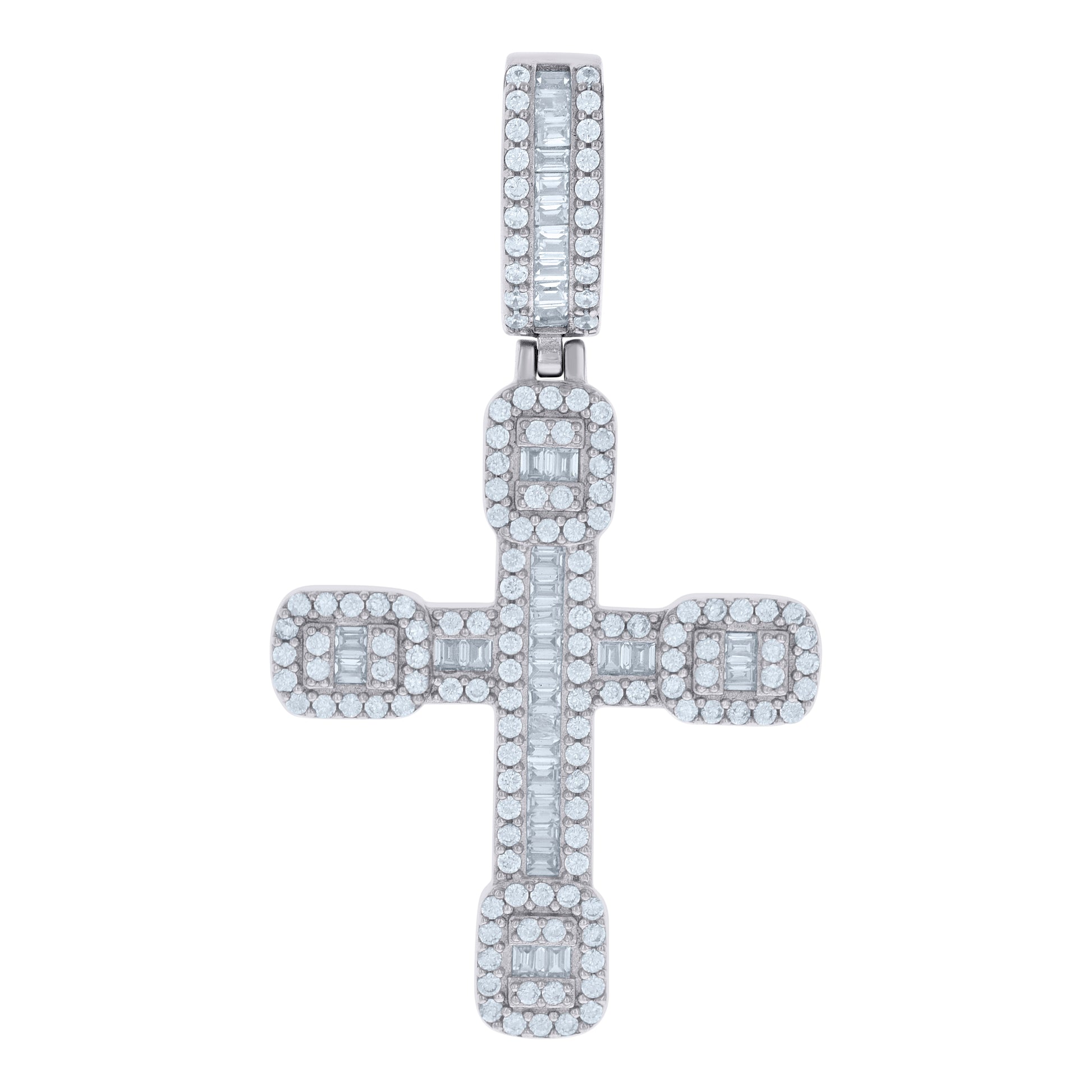925 Sterling Silver Mens Baguette Round Cubic-Zirconia Cross Religious Charm Pendant