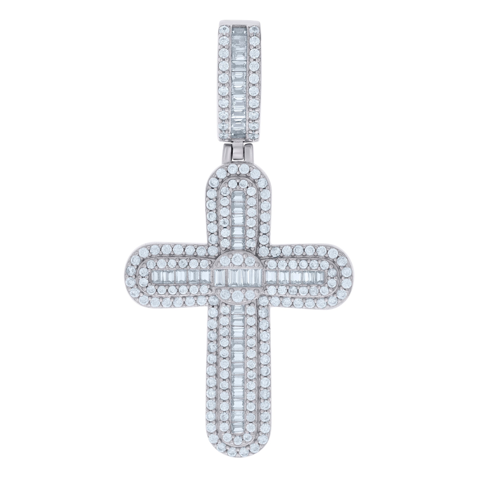925 Sterling Silver Mens Baguette Round Cubic-Zirconia Cross Religious Charm Pendant