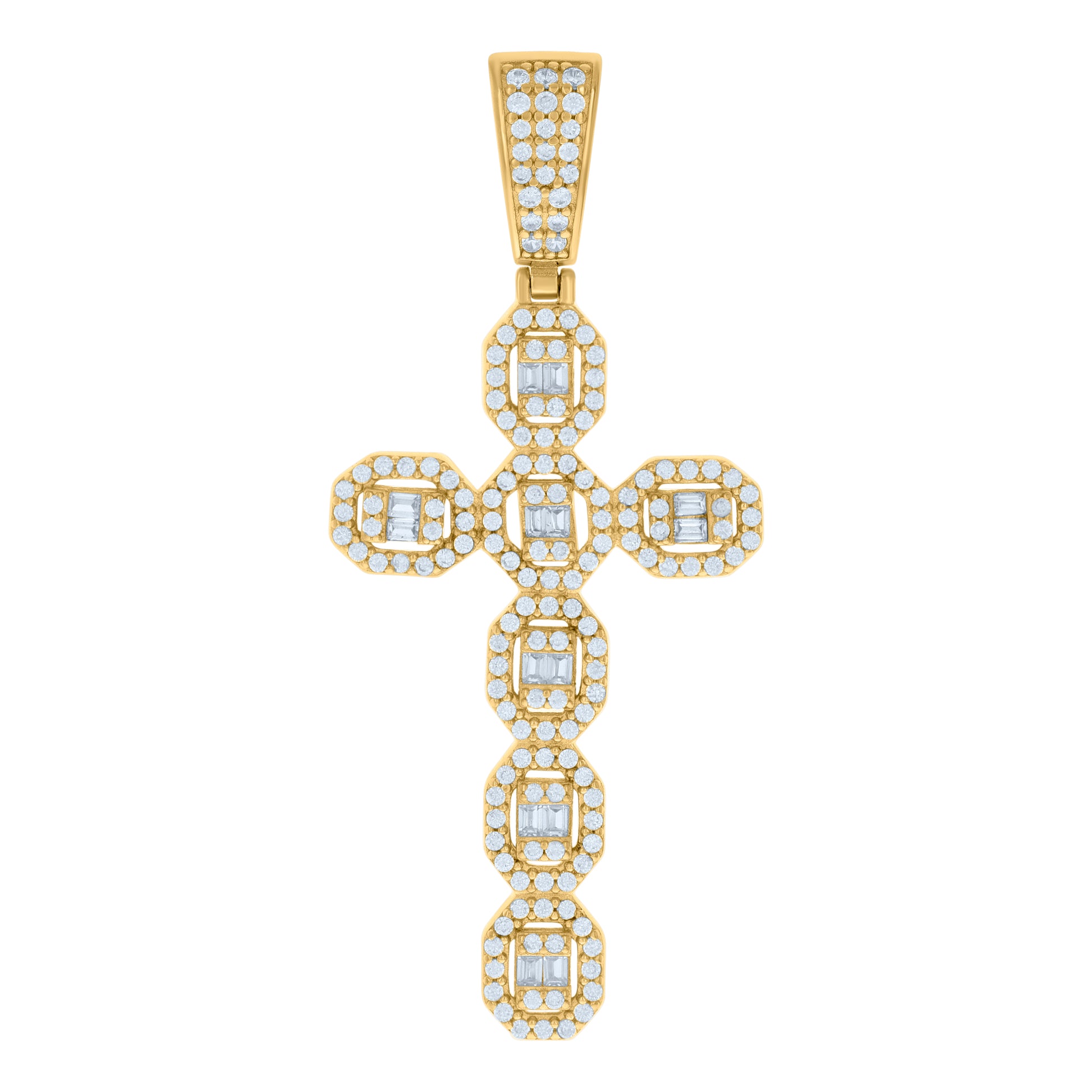 925 Sterling Silver Yellow-tone Mens Baguette Round Cubic-Zirconia Cross Religious Charm Pendant