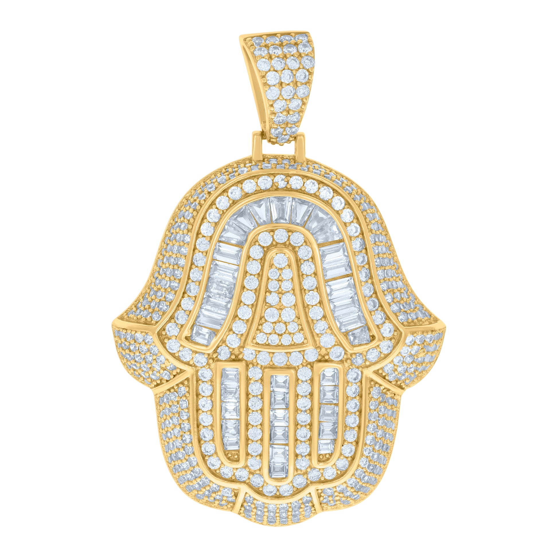925 Sterling Silver Yellow-tone Mens Baguette Round Cubic-Zirconia Hamsa Symbol Religious Pendant