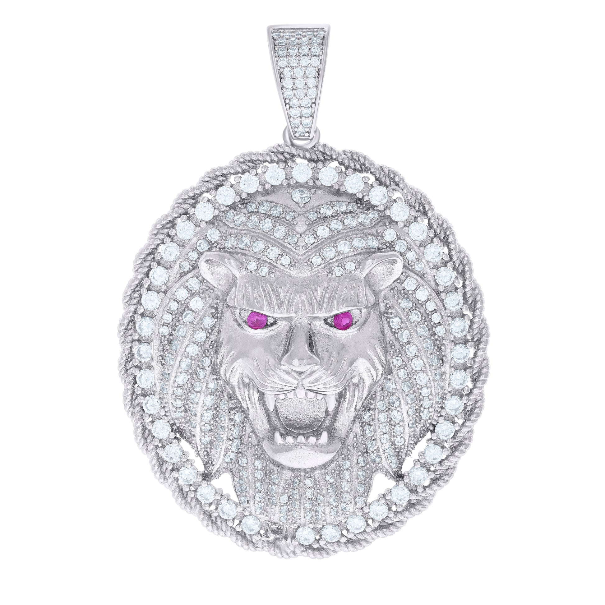 925 Sterling Silver Mens Pink Cubic Zirconia Lion Head Animal Charm Pendant