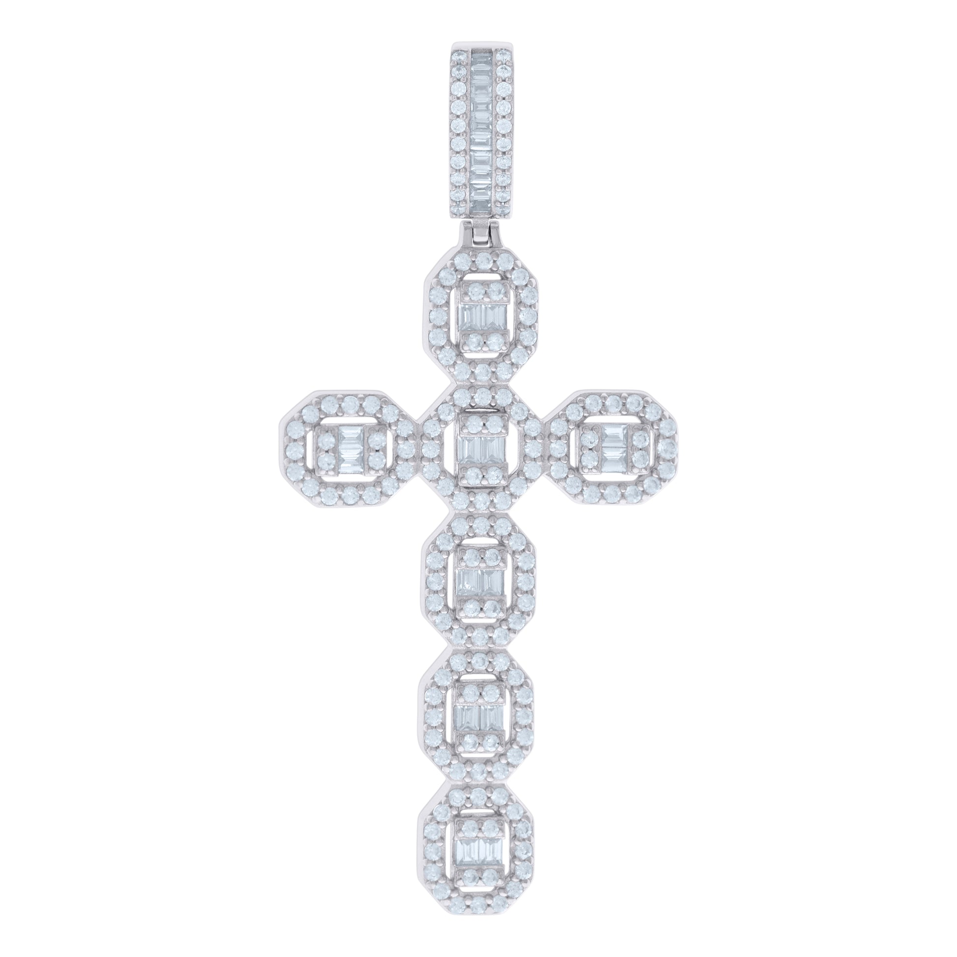 925 Sterling Silver Mens Baguette Round Cubic-Zirconia Cross Religious Charm Pendant