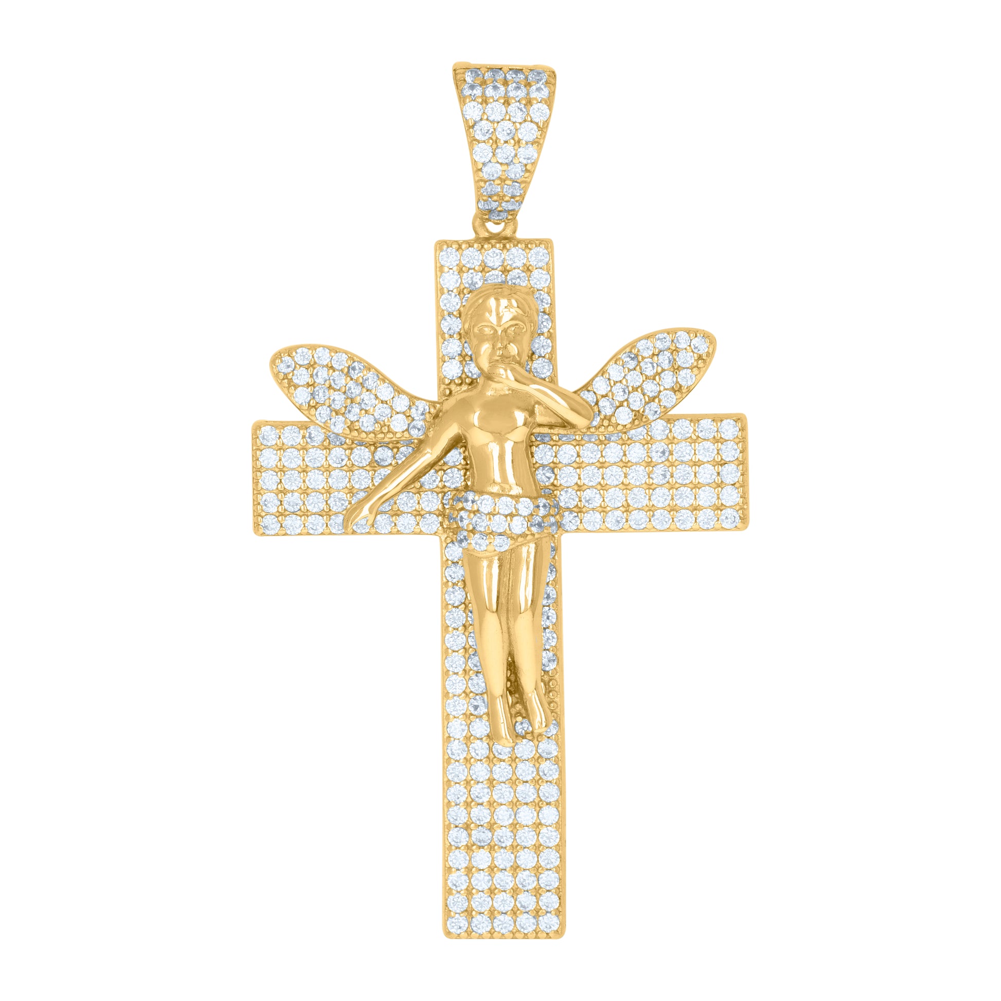 925 Sterling Silver Yellow-Tone Mens Cubic-Zirconia Cross Angel Religious Charm Pendant