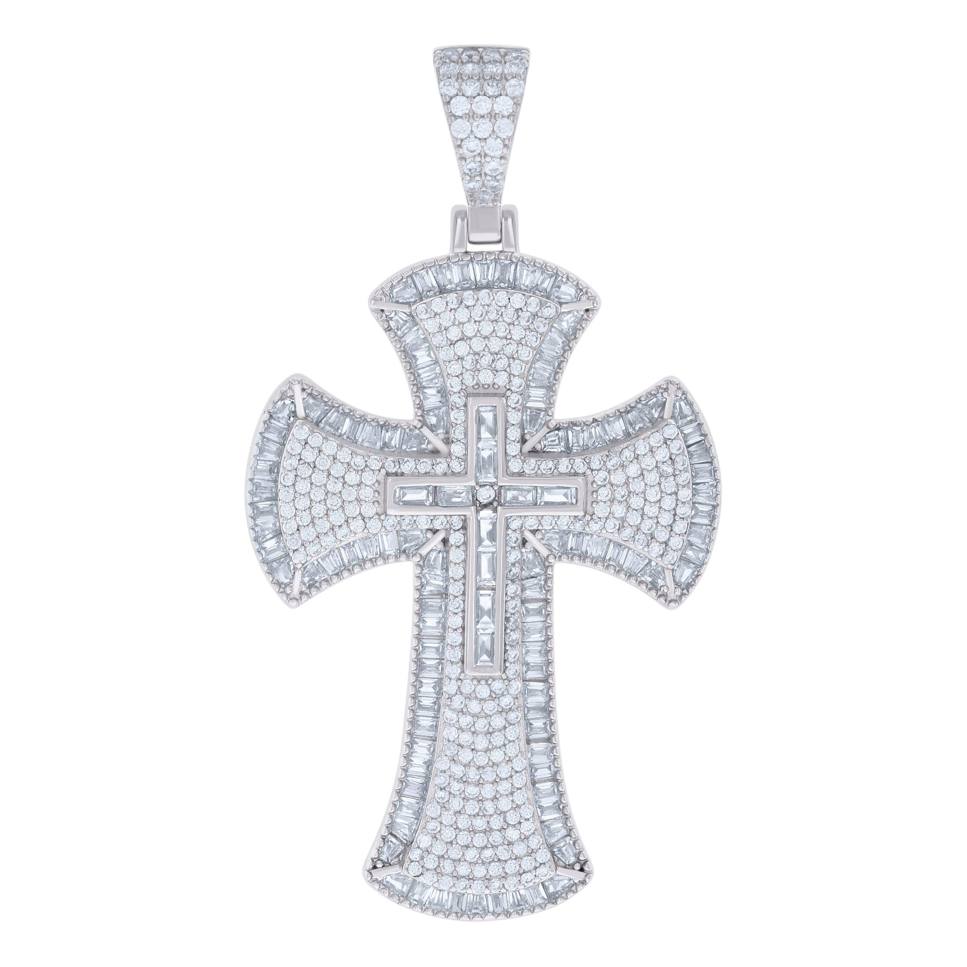 925 Sterling Silver Mens Baguette Round Cubic-Zirconia Cross Religious Charm Pendant