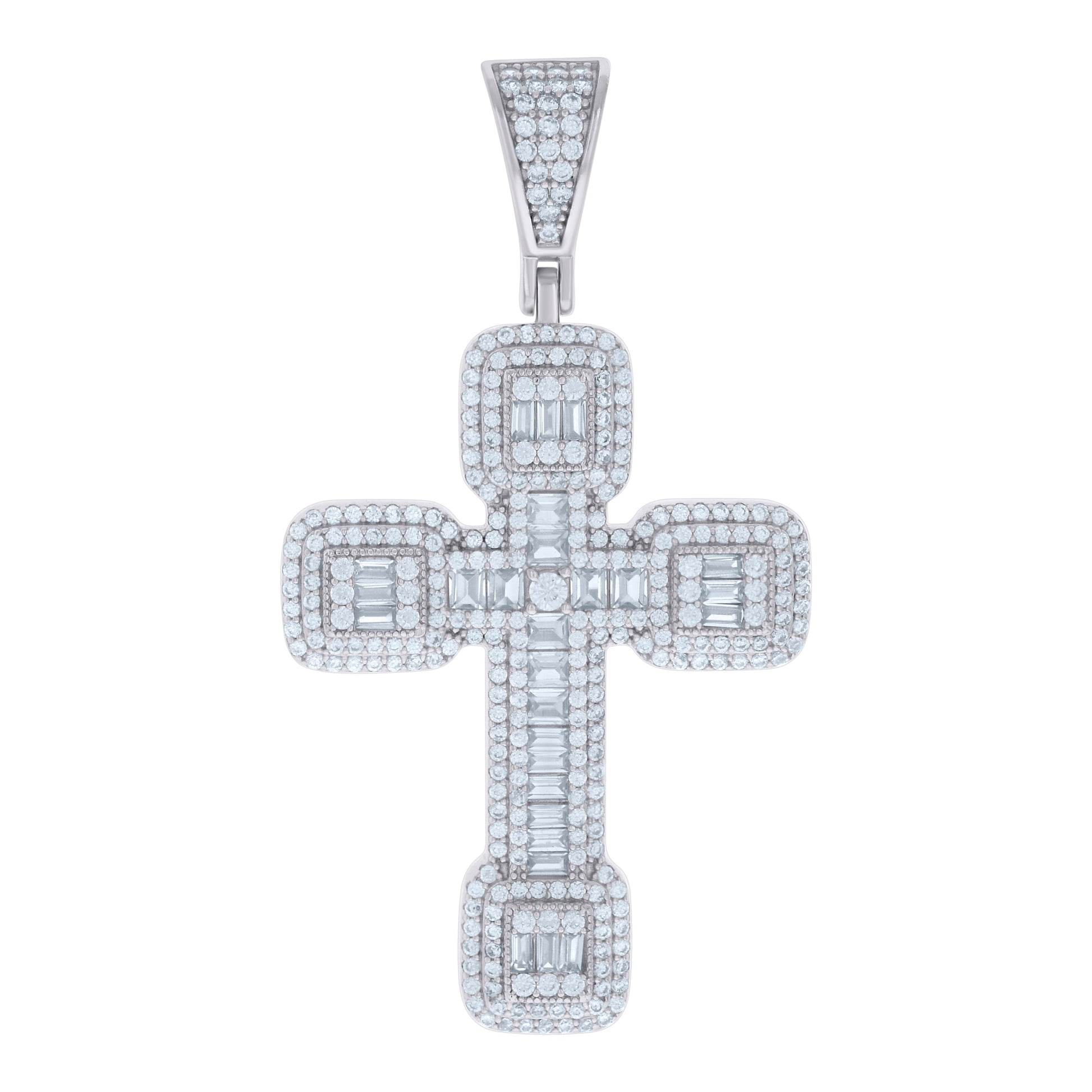 925 Sterling Silver Mens Baguette Round Cubic-Zirconia Cross Religious Charm Pendant