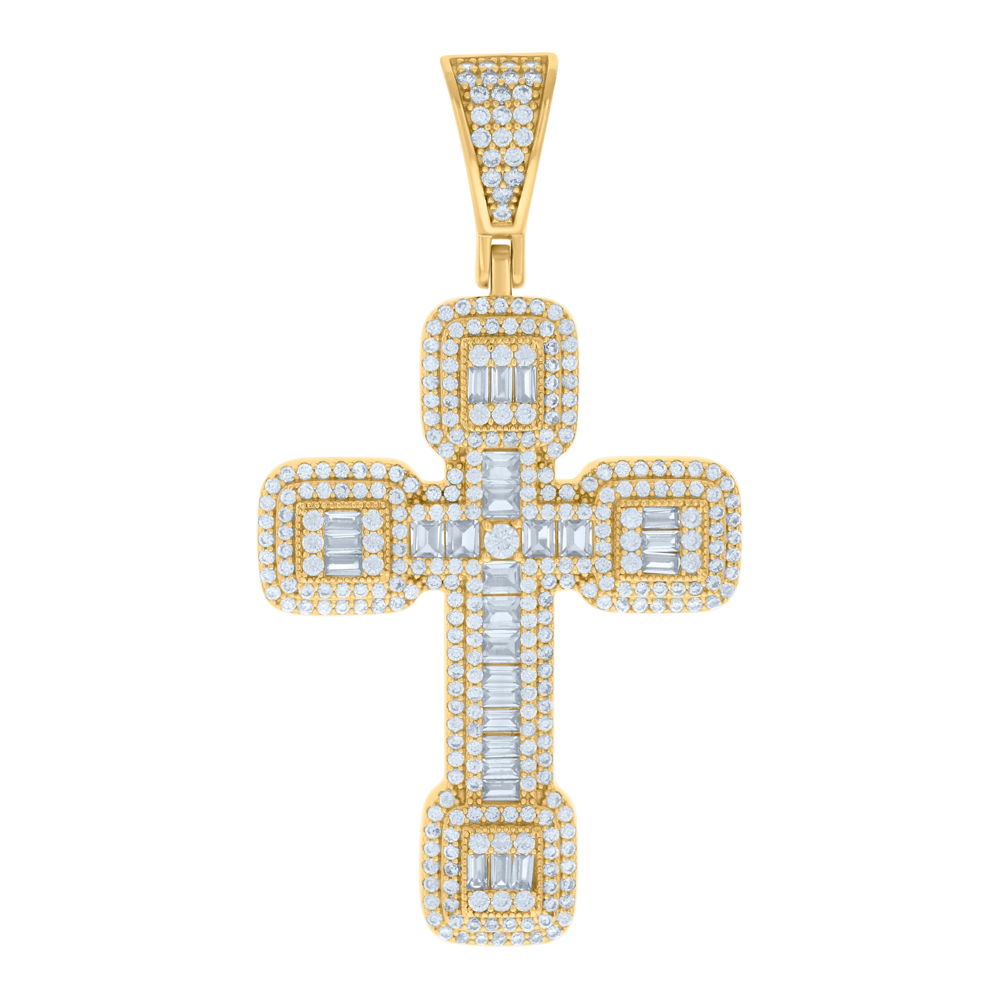 925 Sterling Silver Yellow-tone Mens Baguette Round Cubic-Zirconia Cross Religious Charm Pendant