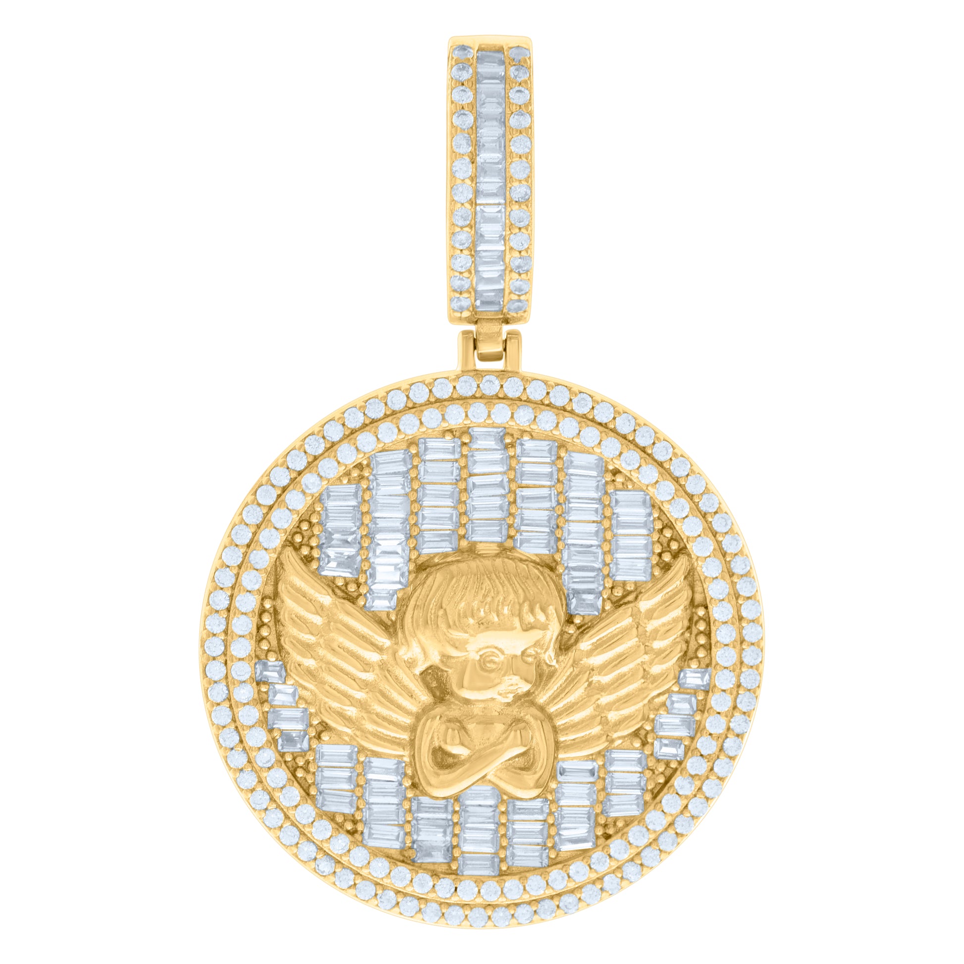 925 Sterling Silver Yellow-tone Mens Baguette Round Cubic-Zirconia Medallion Angle Charm Pendant