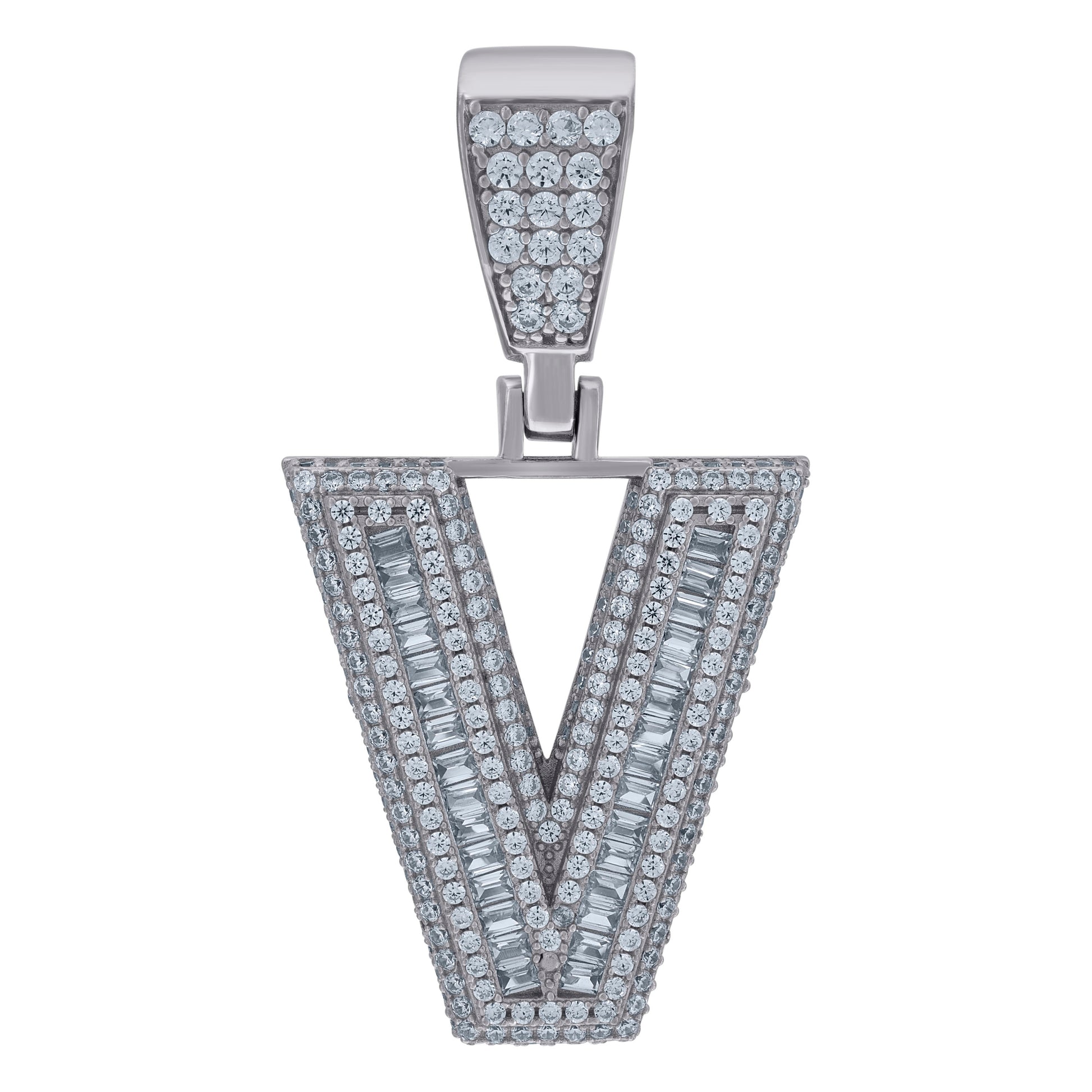 925 Sterling Silver Mens Baguette Cubic-Zirconia Initial Alphabet V Charm Pendant