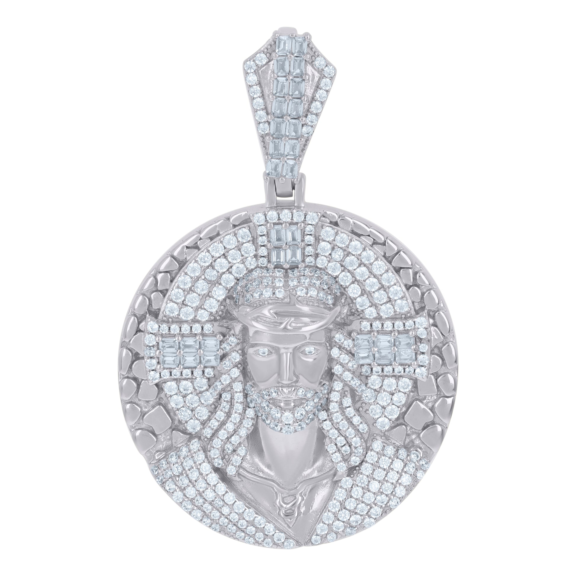 925 Sterling Silver Men Baguette Cubic-Zirconia Medallion Jesus Religious Charm Pendant