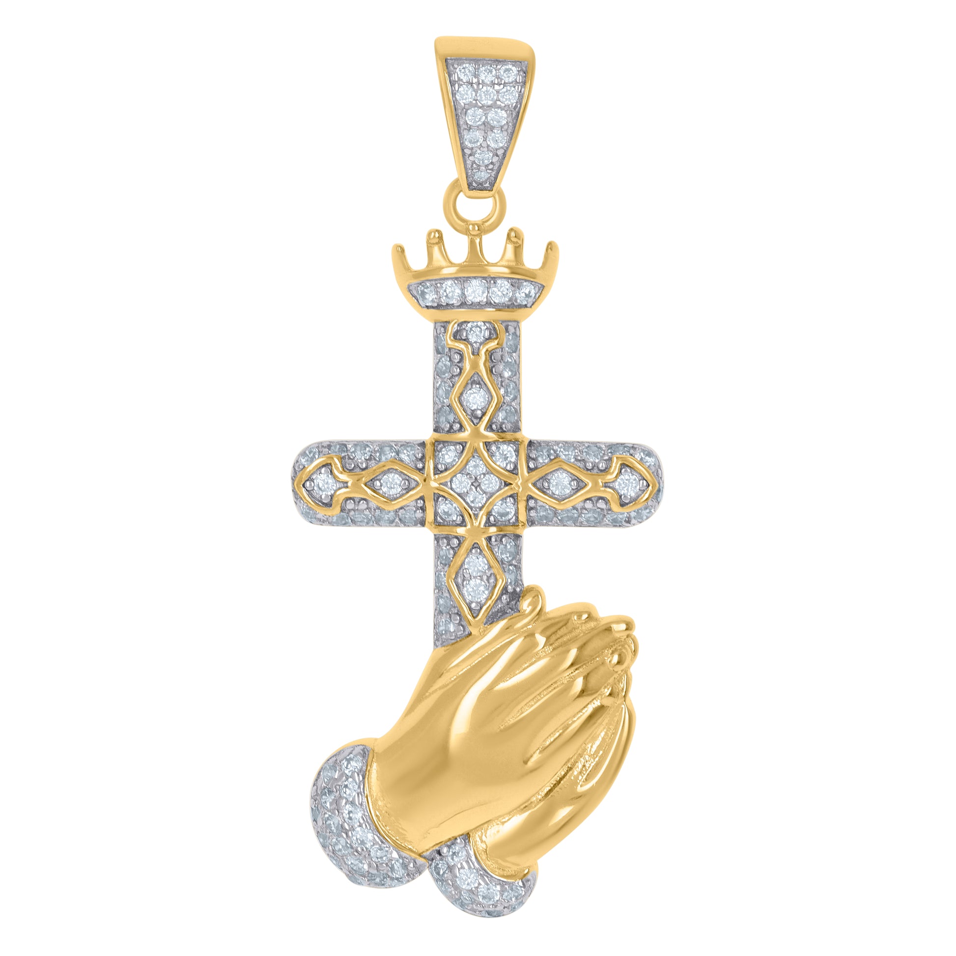 925 Sterling Silver Yellow-Tone Men Cubic-Zirconia Praying Hands Cross Religious Charm Pendant