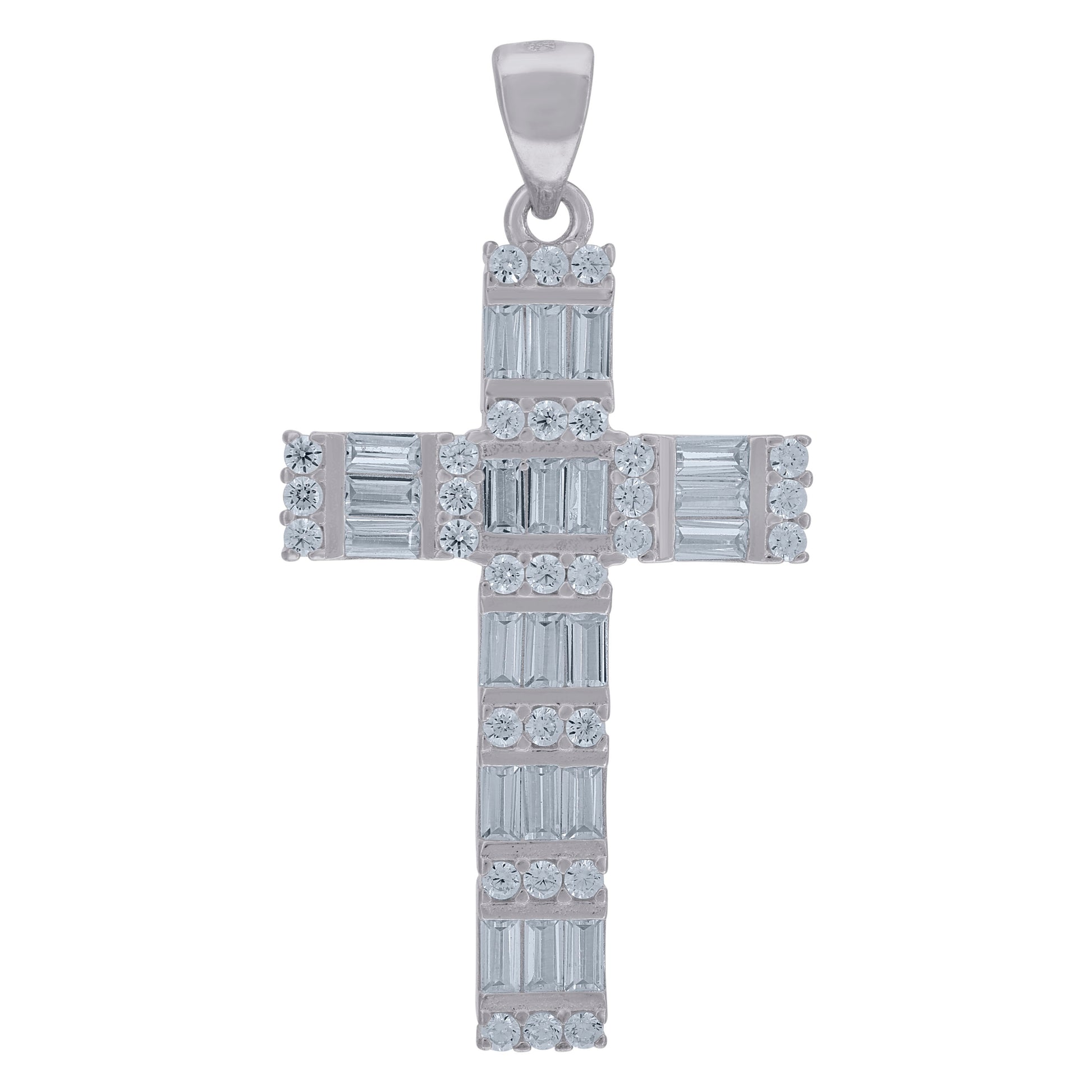 925 Sterling Silver Mens Baguette Cubic-Zirconia Cross Religious Charm Pendant