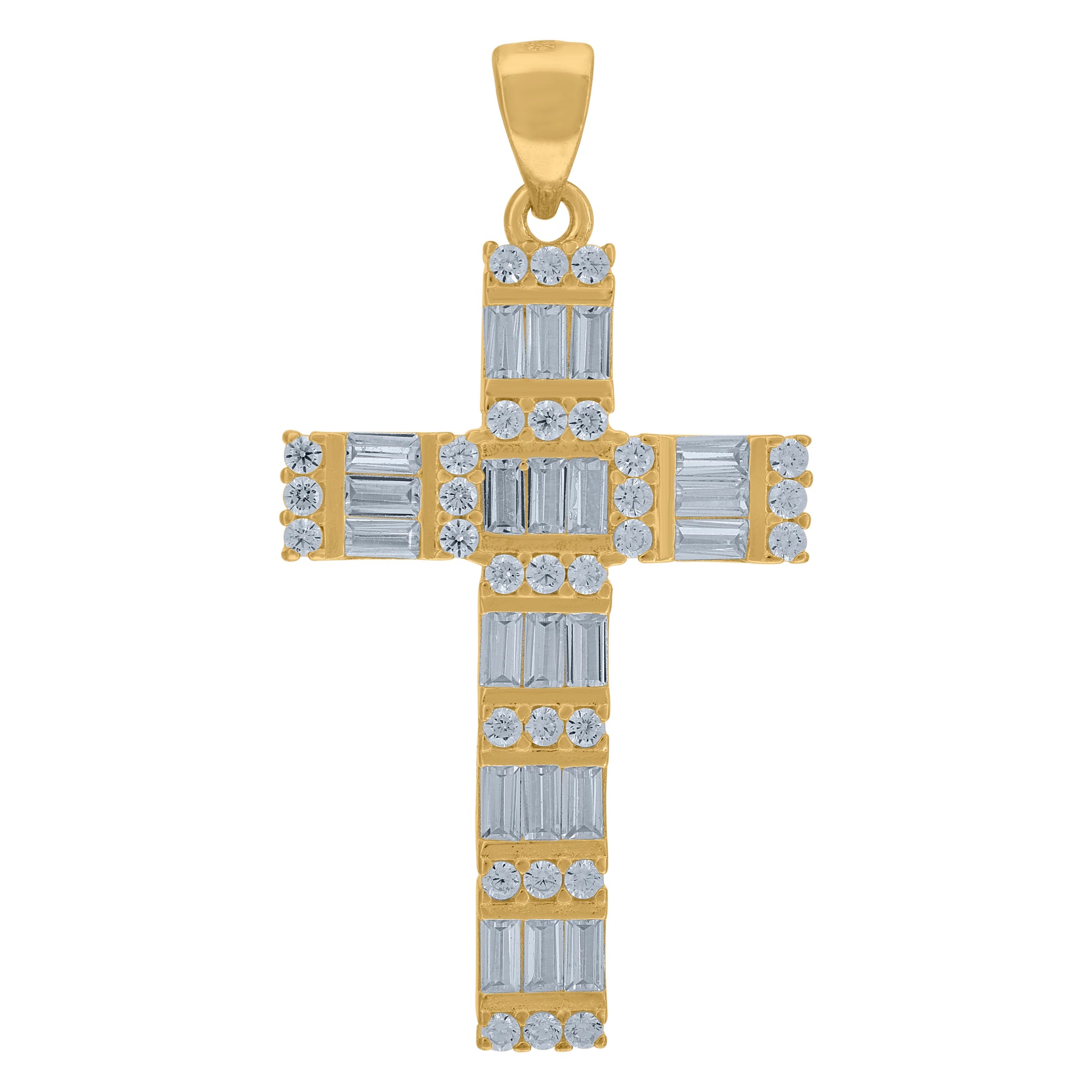 925 Sterling Silver Yellow-Tone Mens Baguette Cubic-Zirconia Cross Religious Charm Pendant