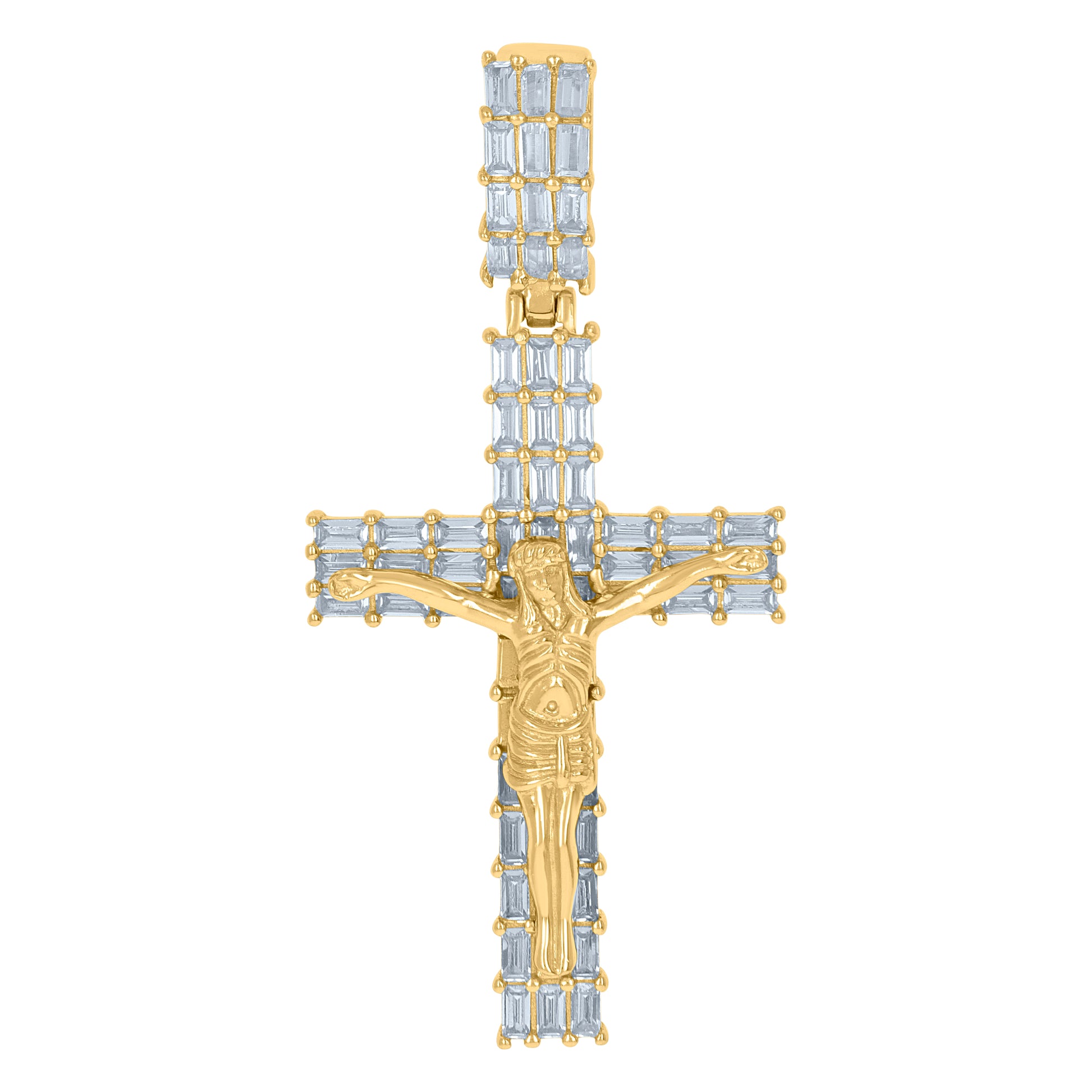 925 Sterling Silver Yellow-Tone Mens Baguette Cubic-Zirconia Crucifix Cross Religious Charm Pendant