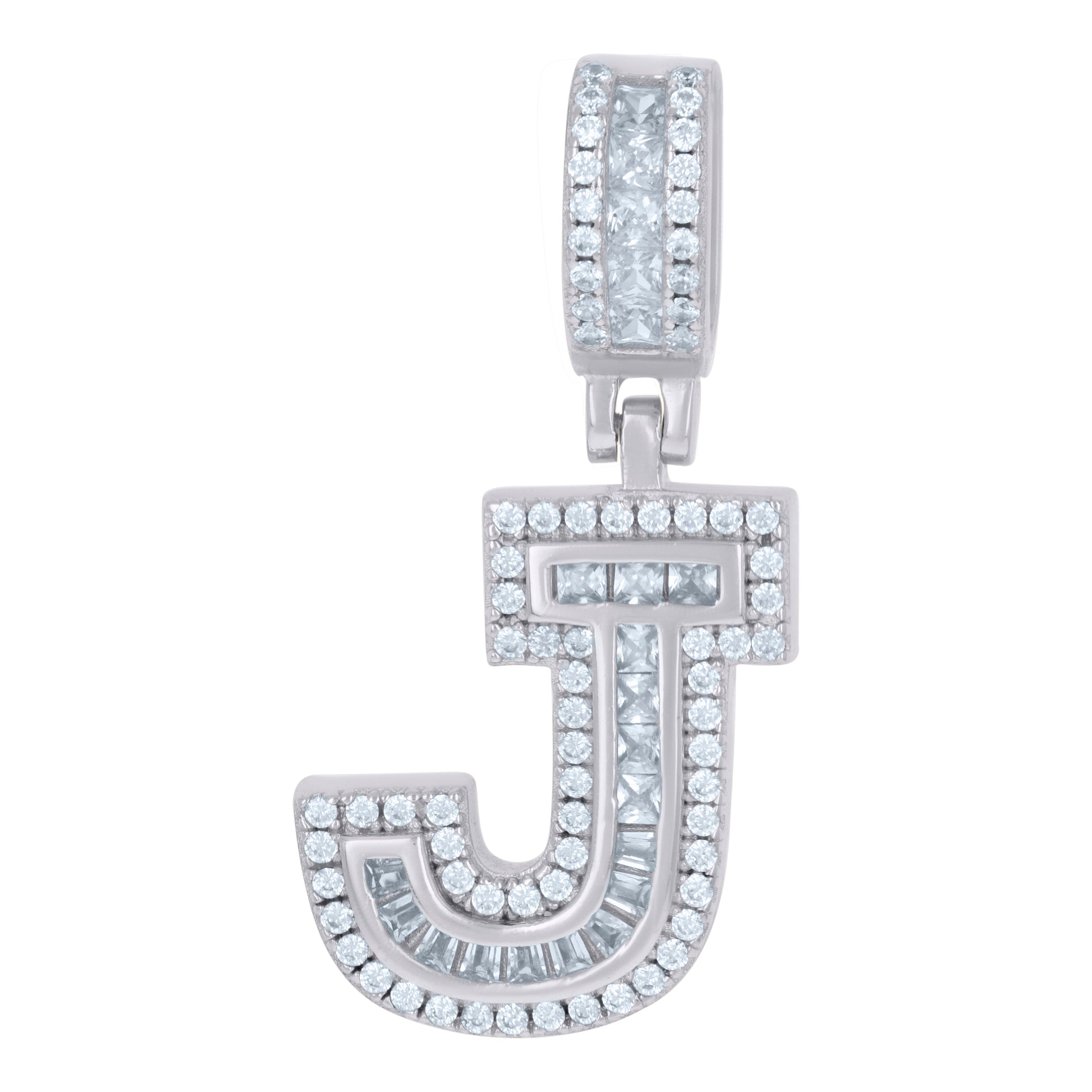 925 Sterling Silver Unisex Round & Baguette Cubic-Zirconia Initial Alphabet J Pendant Charm