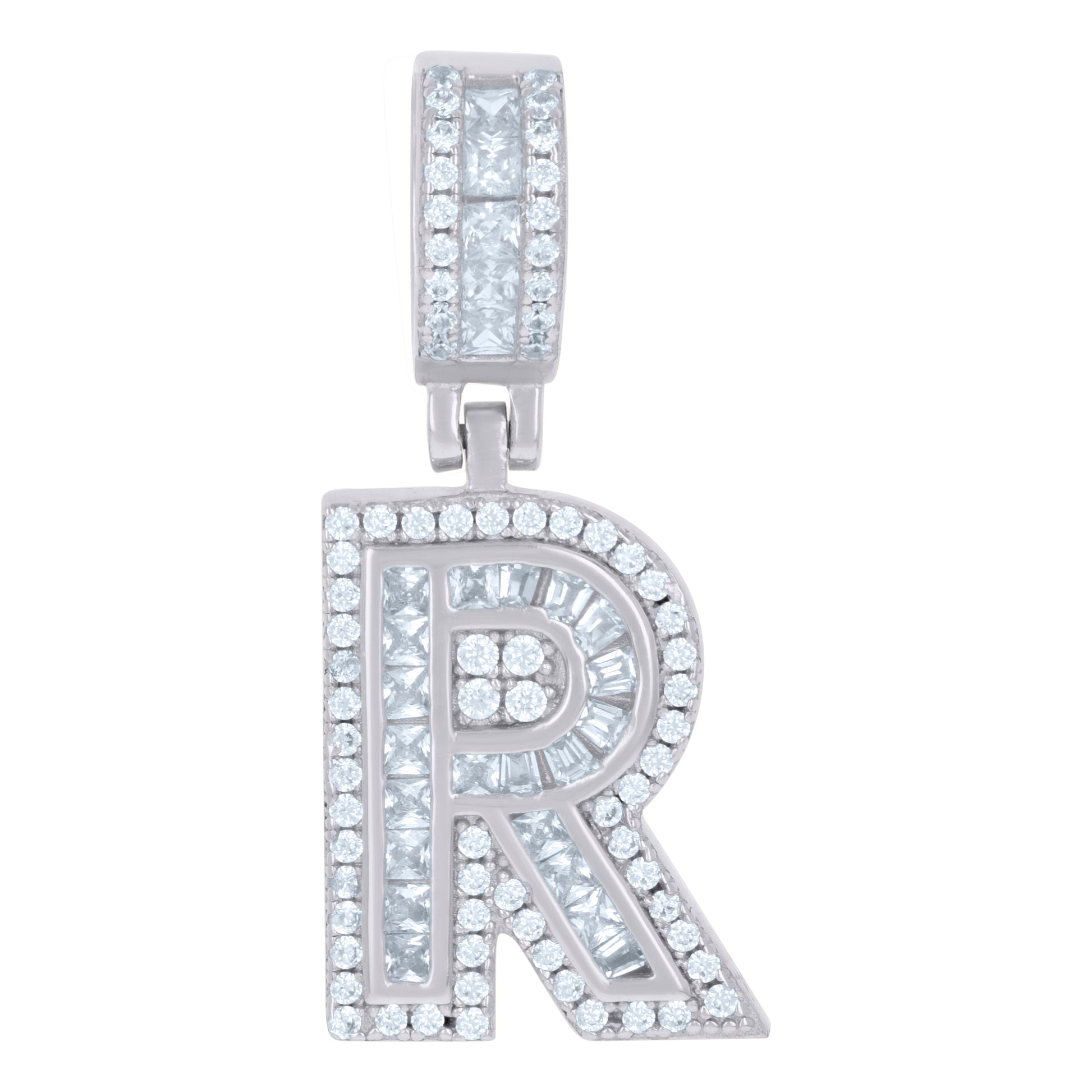 925 Sterling Silver Unisex Round & Baguette Cubic-Zirconia Initial Alphabet R Pendant Charm