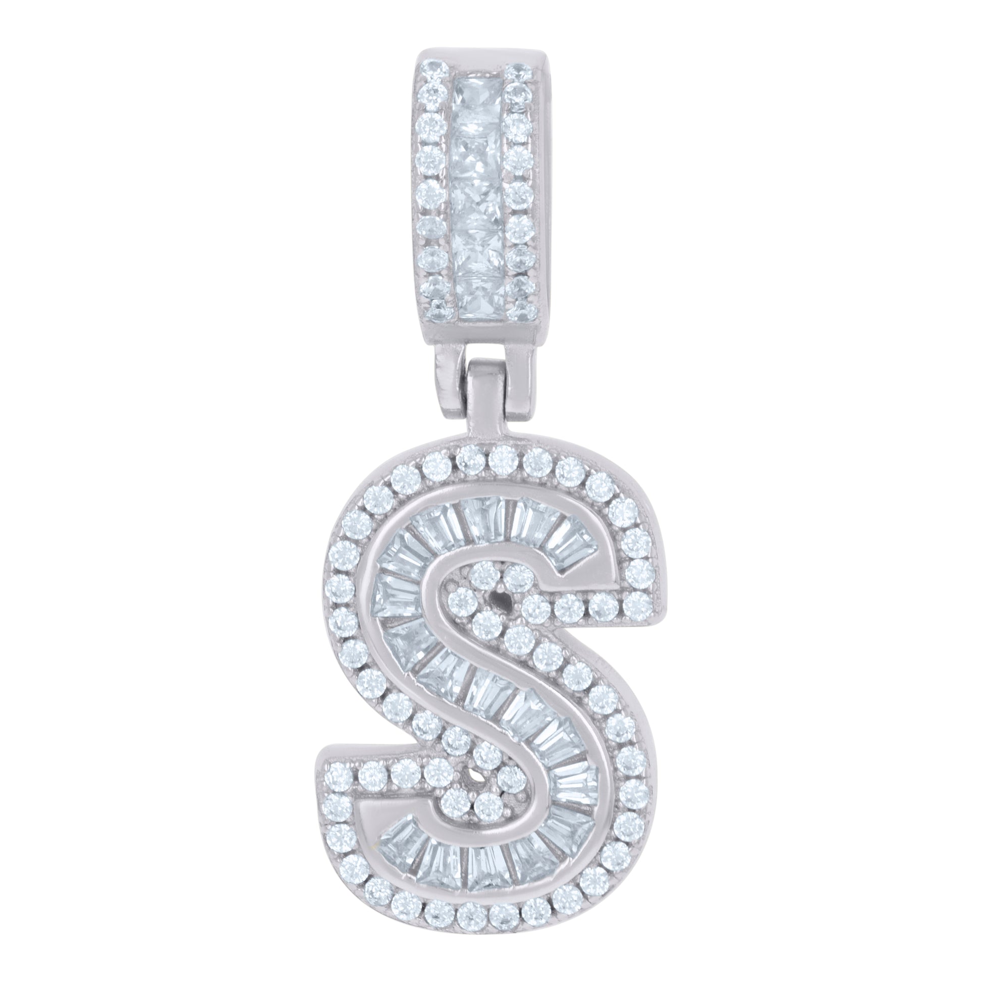 925 Sterling Silver Unisex Round & Baguette Cubic-Zirconia Initial Alphabet S Pendant Charm