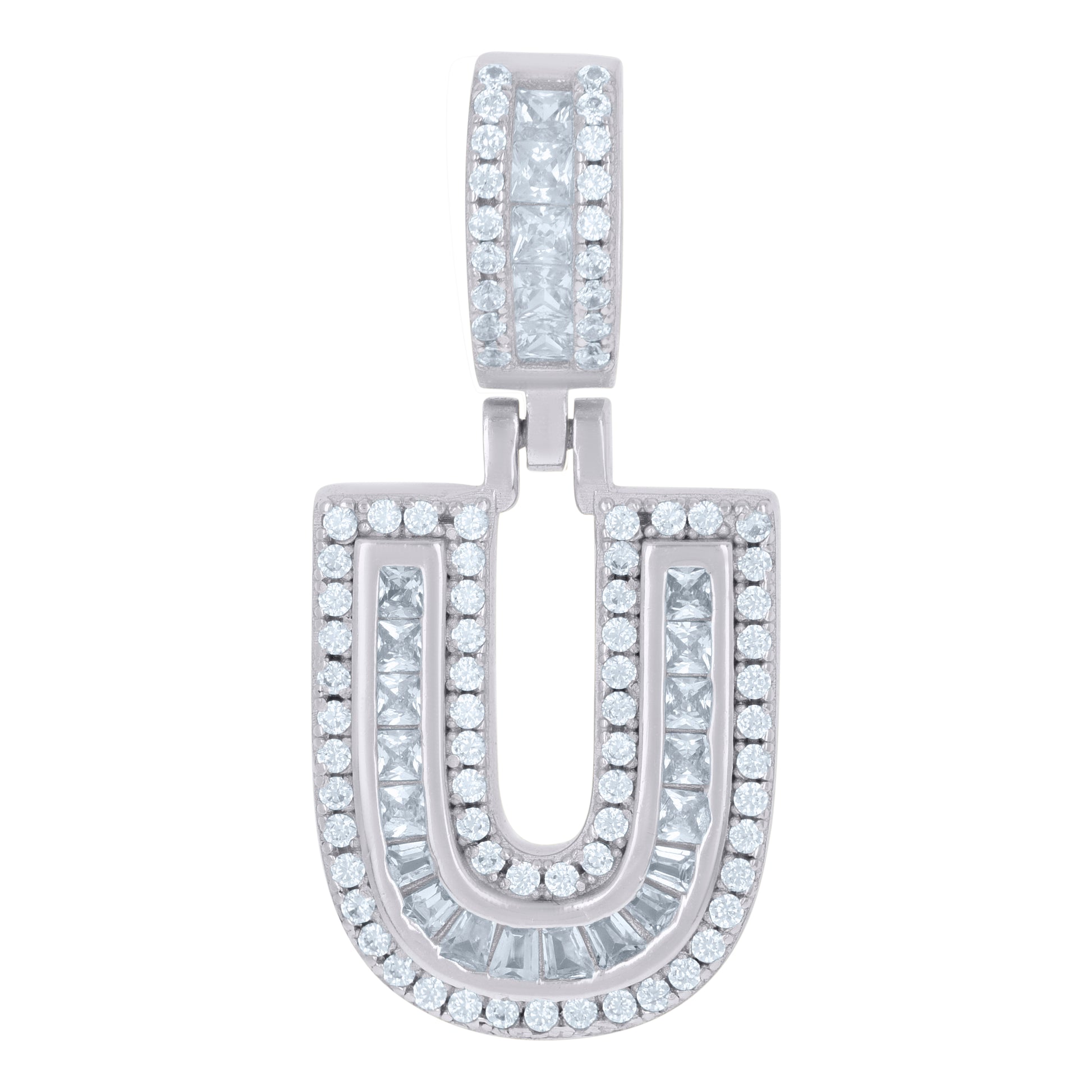 925 Sterling Silver Unisex Round & Baguette Cubic-Zirconia Initial Alphabet U Pendant Charm
