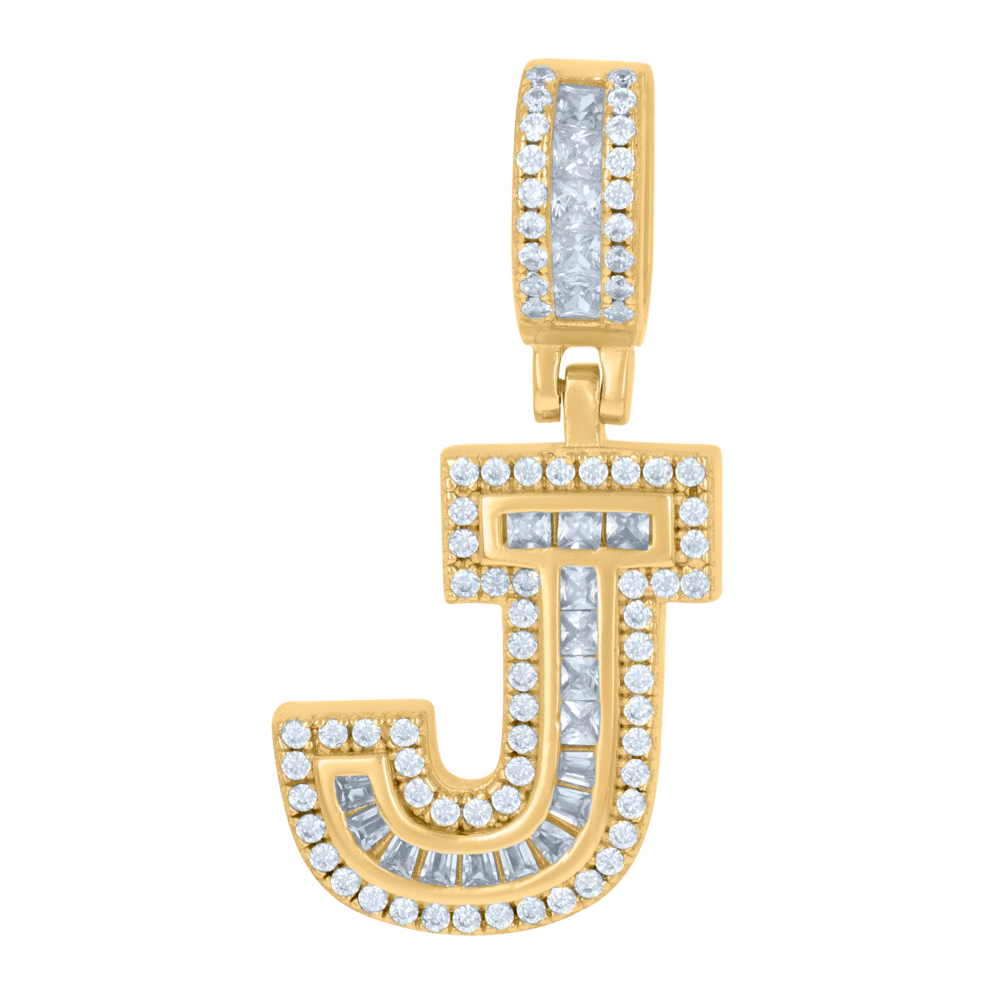 925 Sterling Silver Unisex Round & Baguette Cubic-Zirconia Initial Alphabet J Pendant Charm