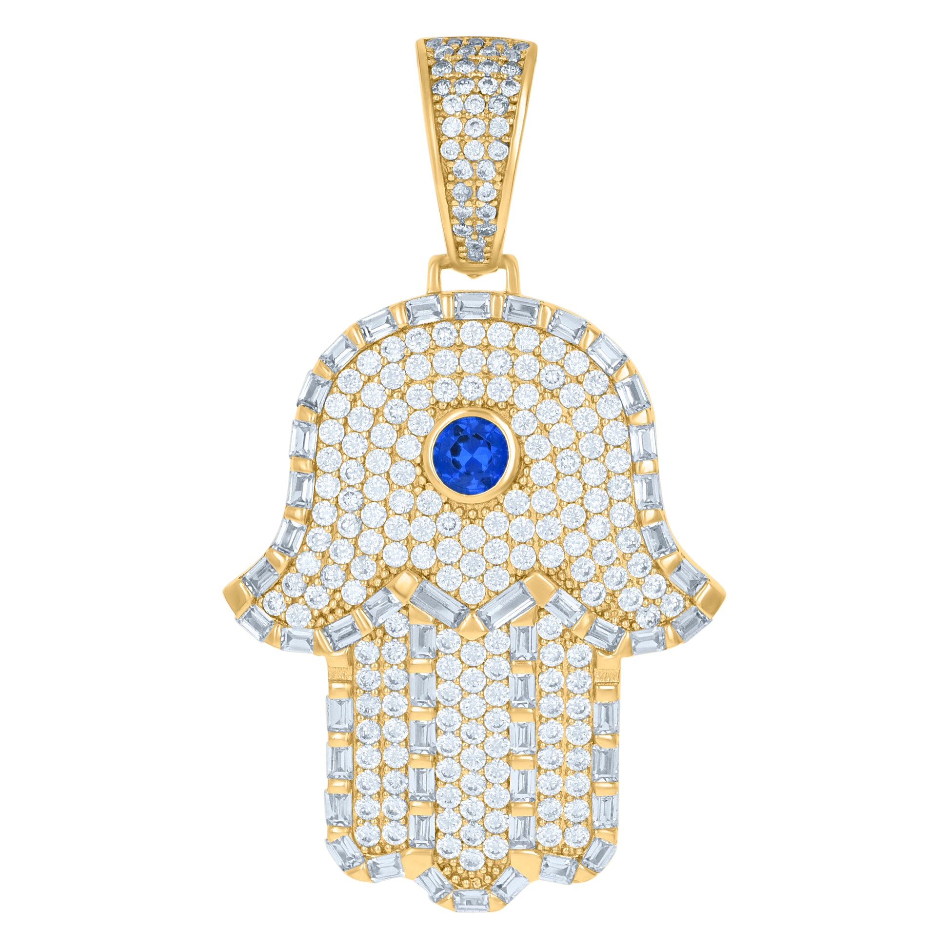 925 Sterling Silver Yellow-Tone Mens Blue White Baguette Round Cubic-Zirconia Hamsa Religious Charm Pendant
