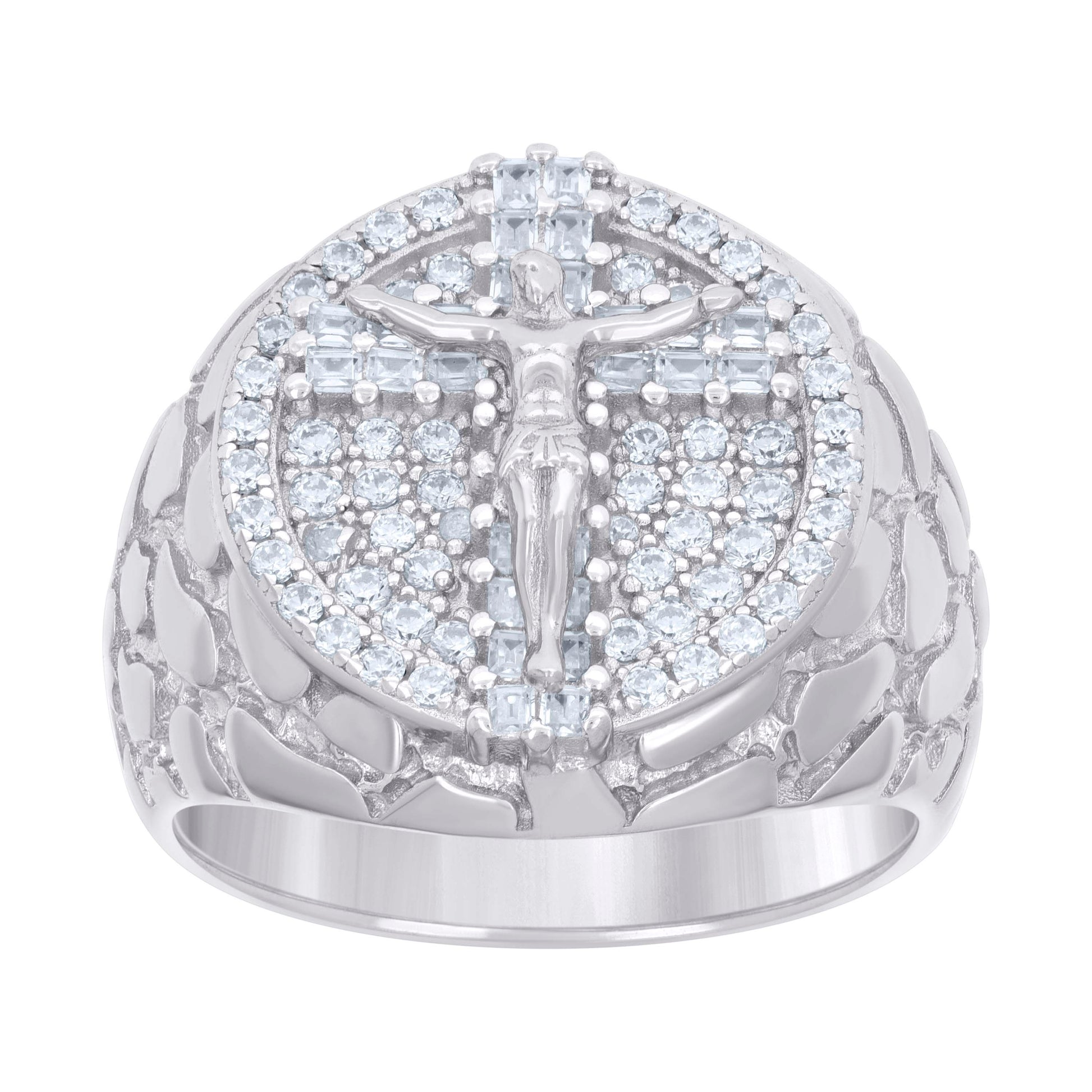 925 Sterling Silver Mens Baguette Round Cubic-Zirconia Nugget Crucifix Cross Religious Ring Size 8