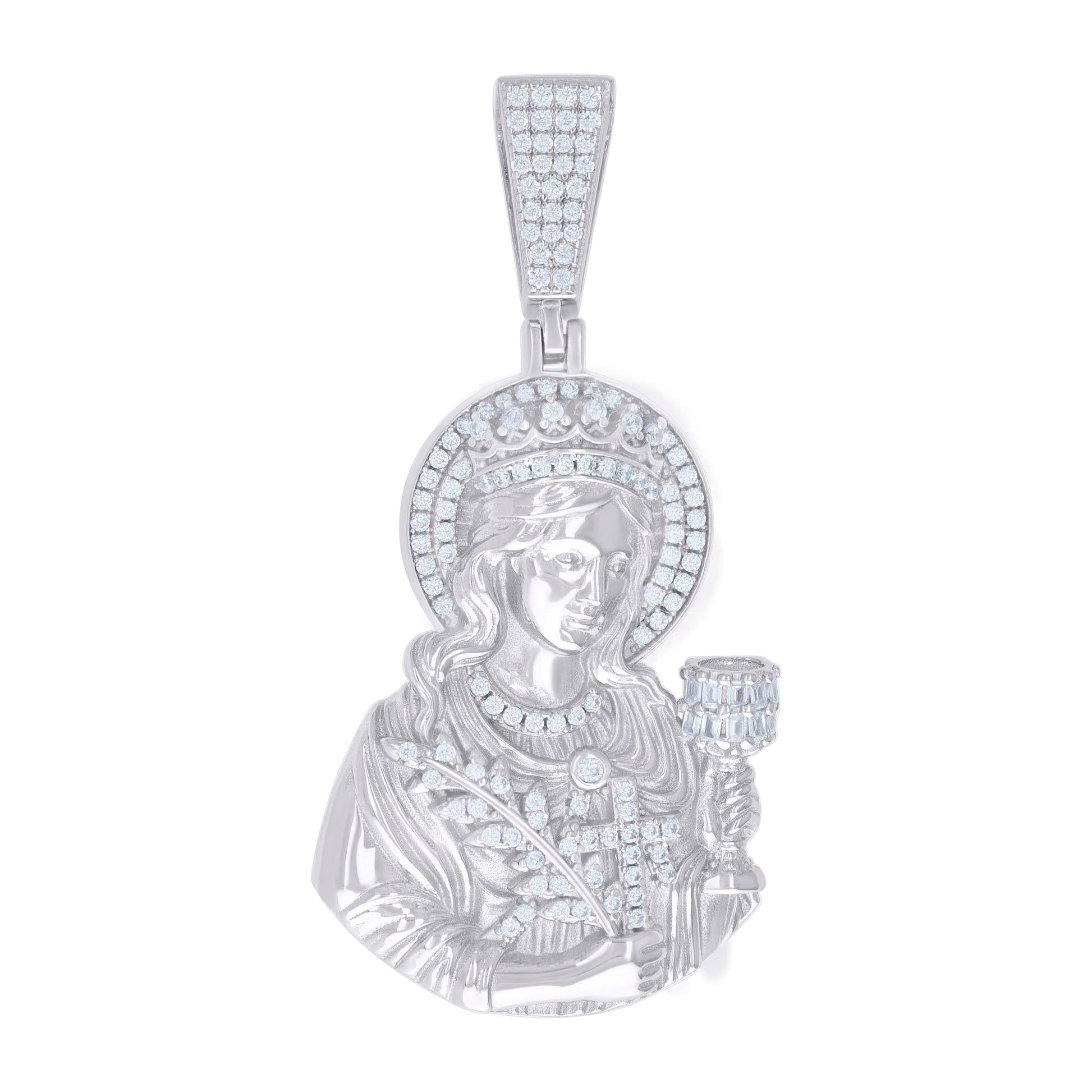 925 Sterling Silver Mens Round 0.69ct Baguette 0.99ct Moissanite St. Barbara Saints Religious Pendant