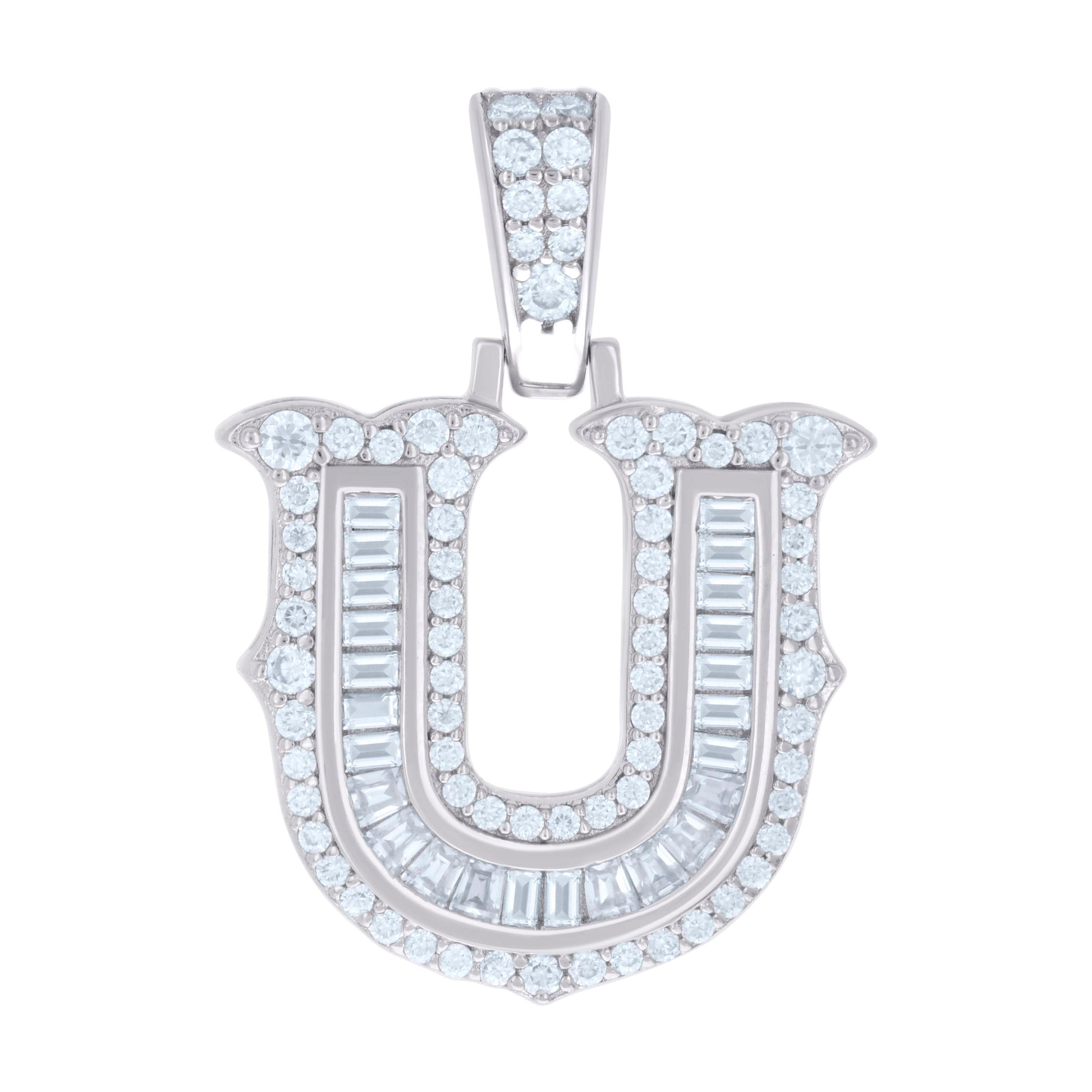 925 Sterling Silver Unisex Baguette Round Moissanite 0.61ct Initial Alphabet U Charm Pendant