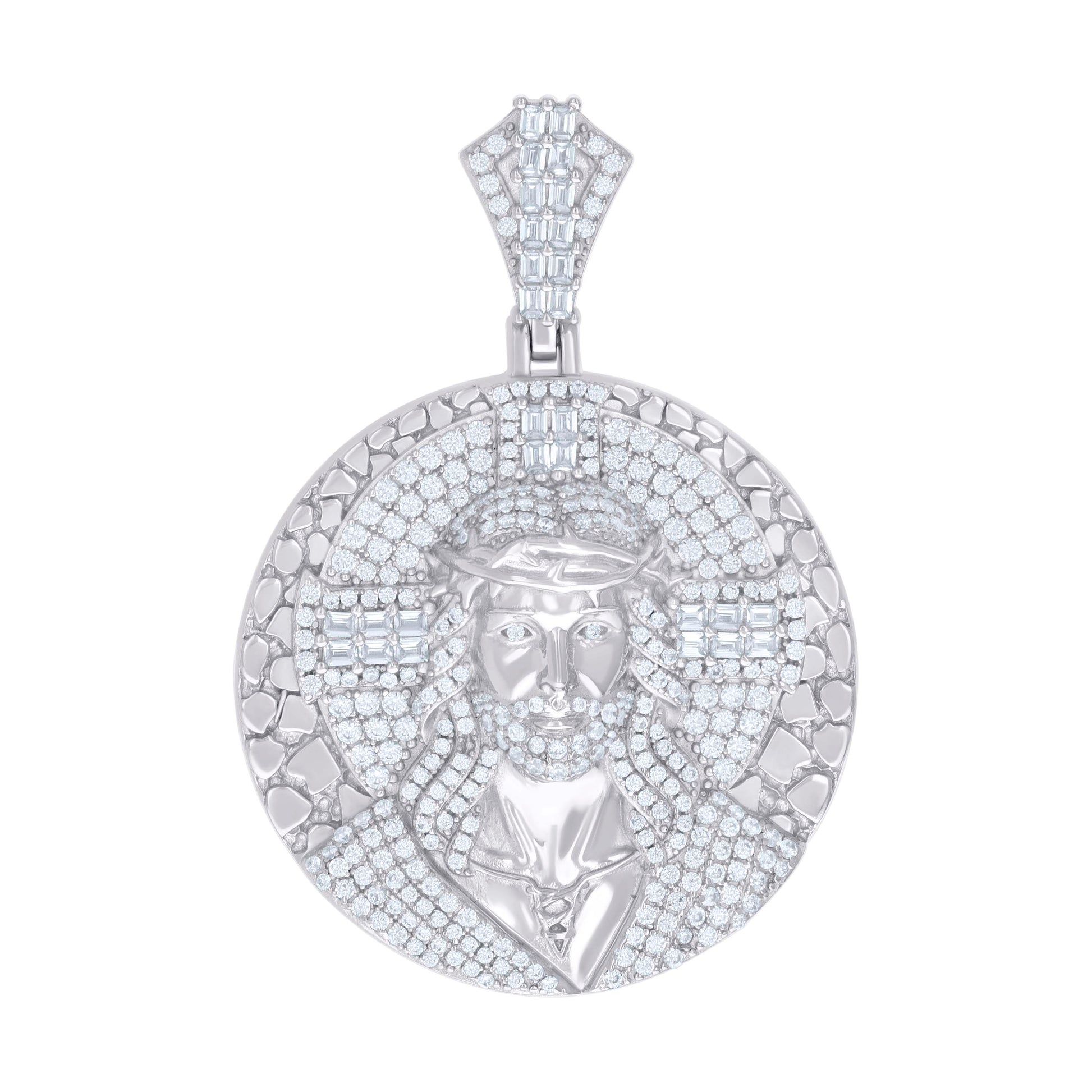 925 Sterling Silver Mens Round Baguette Moissanite Jesus Religious Charm Pendant