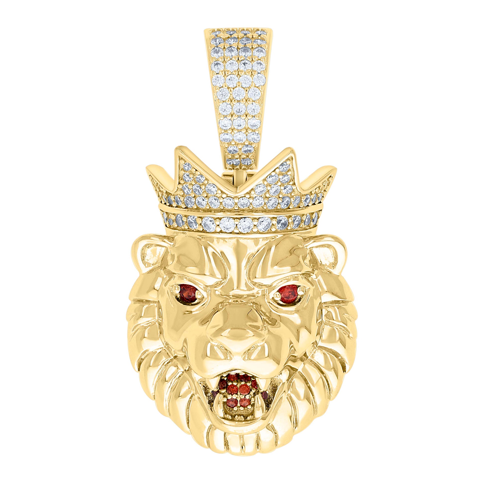 925 Sterling Silver Yellow -Tone Mens White Red Moissanite Leo/Lion Head Wildlife Charm Pendant