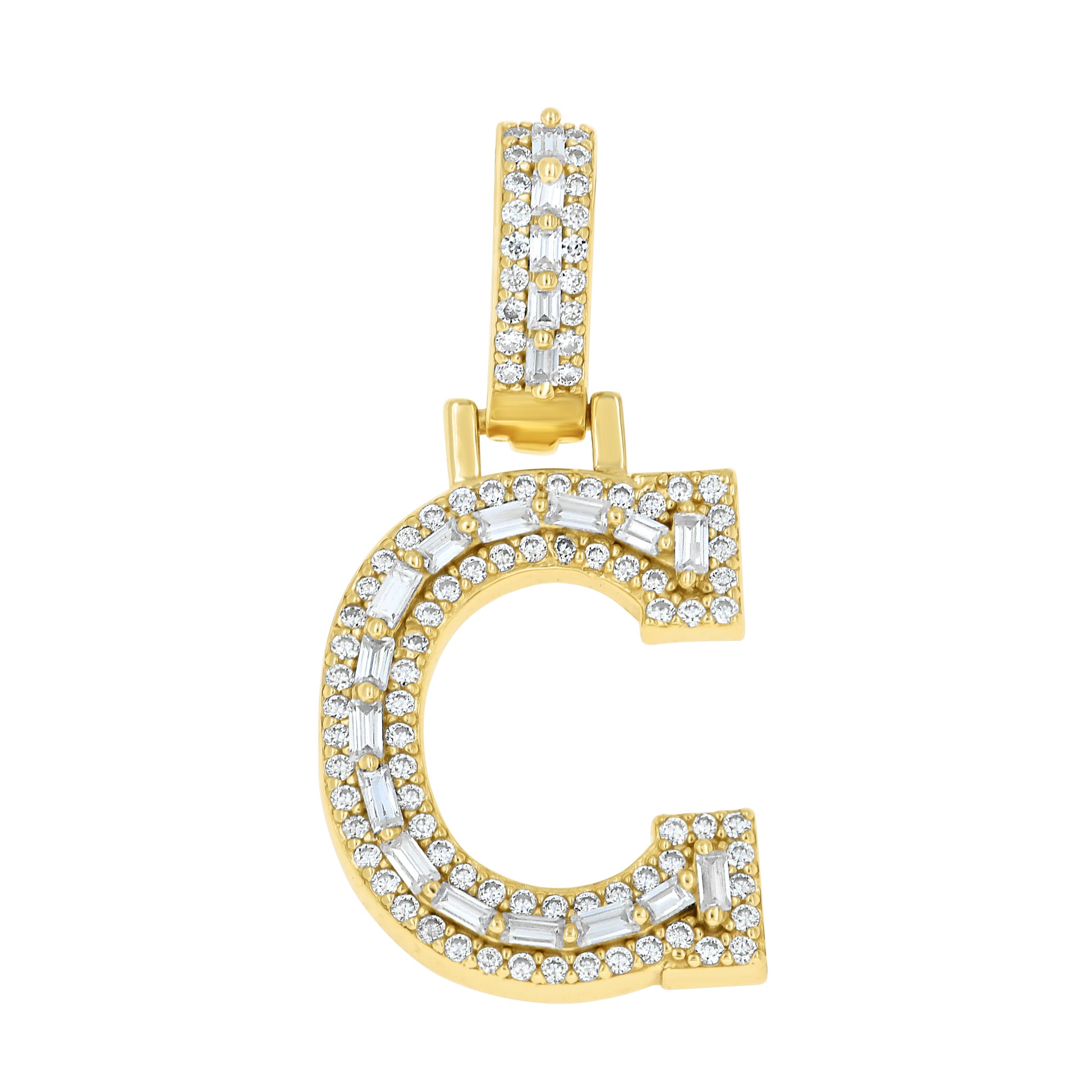 925 Sterling Silver Yellow-Tone Unisex Baguette Round Moissanite Initial Alphabet C Charm Pendant